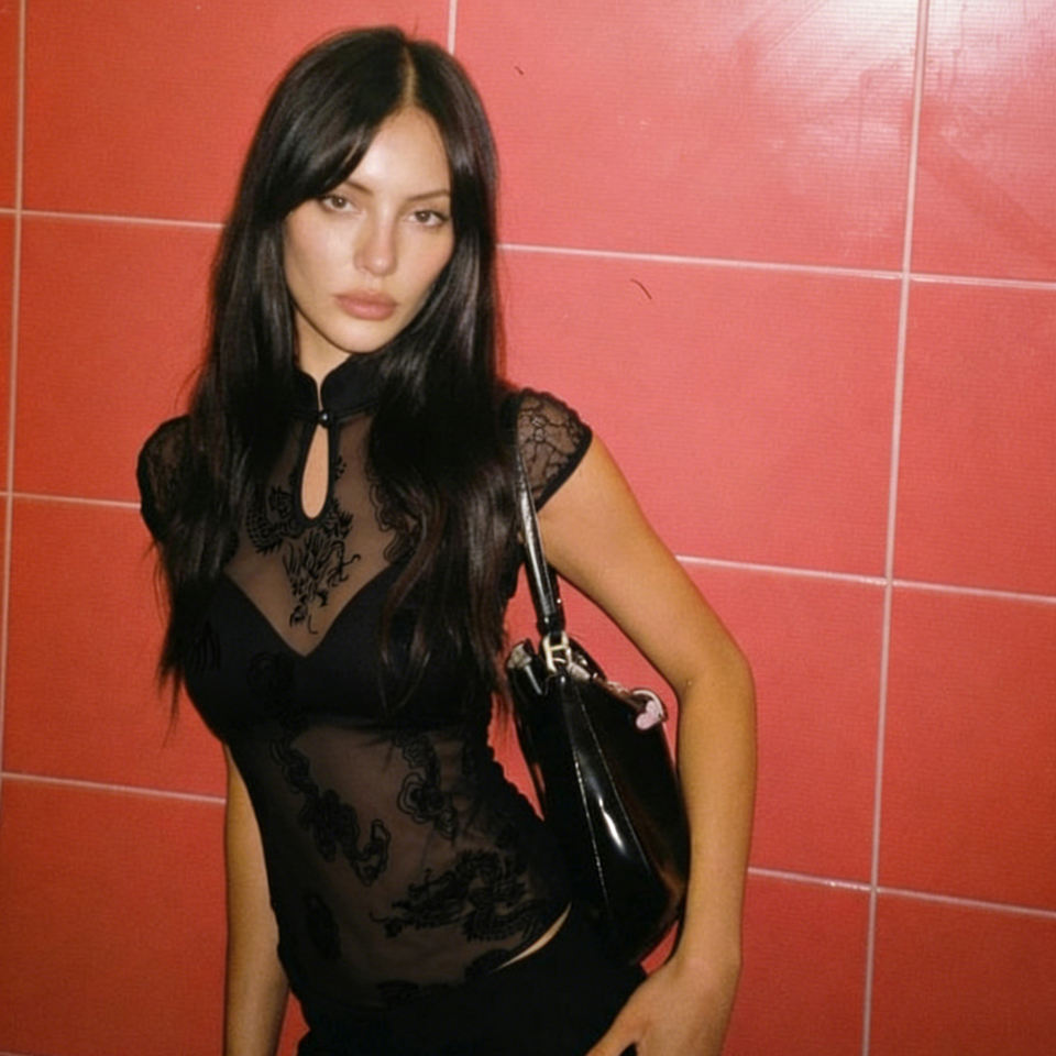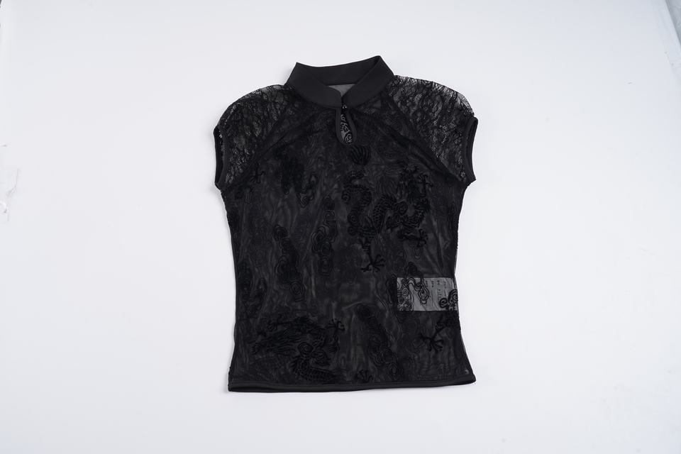 เสื้อเชิ้ตตาข่ายปักลายมังกรสไตล์จีน คอเสื้อแบบกี่เพ้า แขนสั้น ทรงเข้ารูป เซ็กซี่ สาวฮอต เสื้อยืดลำลอง