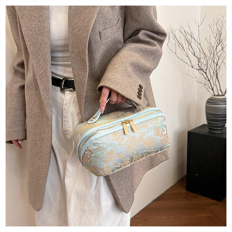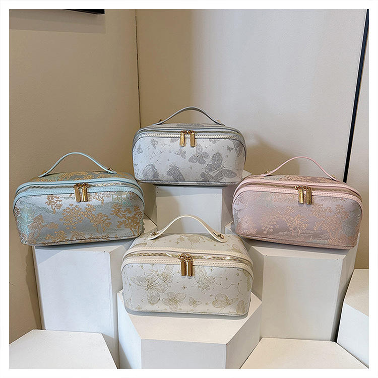 กระเป๋าเครื่องสำอางผ้าไหมปักลายผีเสื้อสไตล์จีน รูปทรงหมอน ดีไซน์หรูหราสำหรับสุภาพสตรี ใช้สำหรับจัดเก็บเครื่องสำอางและอุปกรณ์อาบน้ำสำหรับการเดินทาง