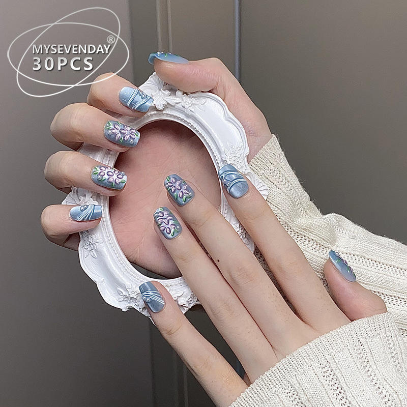 สติกเกอร์เล็บปลอมแบบถอดออกได้ทำด้วยมือ30ชิ้นบล็อกสีดอกไม้สไตล์จีน