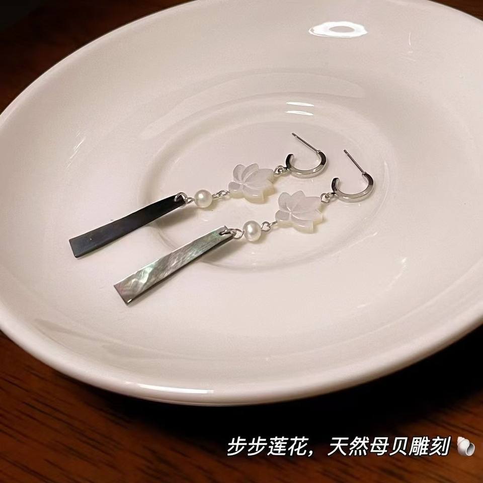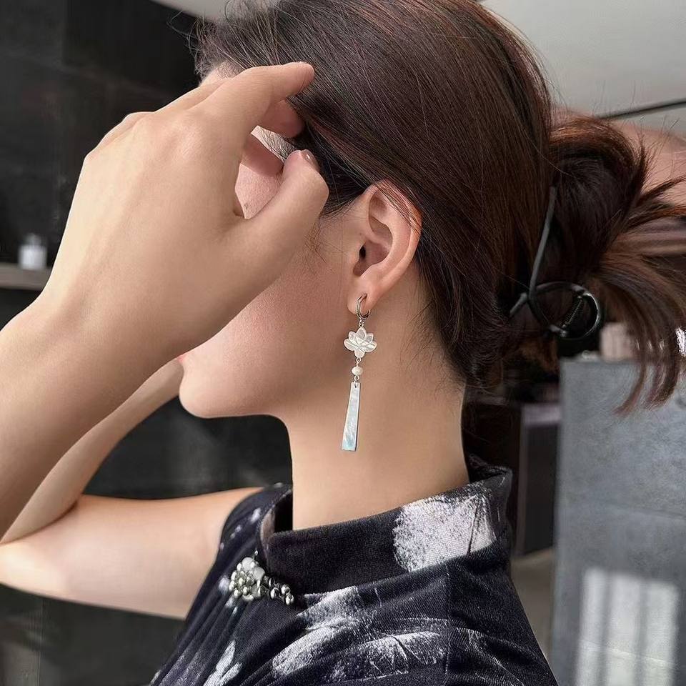 ต่างหูทรงสี่เหลี่ยมประดับเปลือกหอยมุกสีดำสไตล์จีน พร้อมพู่ห้อย ดีไซน์หรูหรา ให้เสน่ห์แบบตะวันออกโบราณ