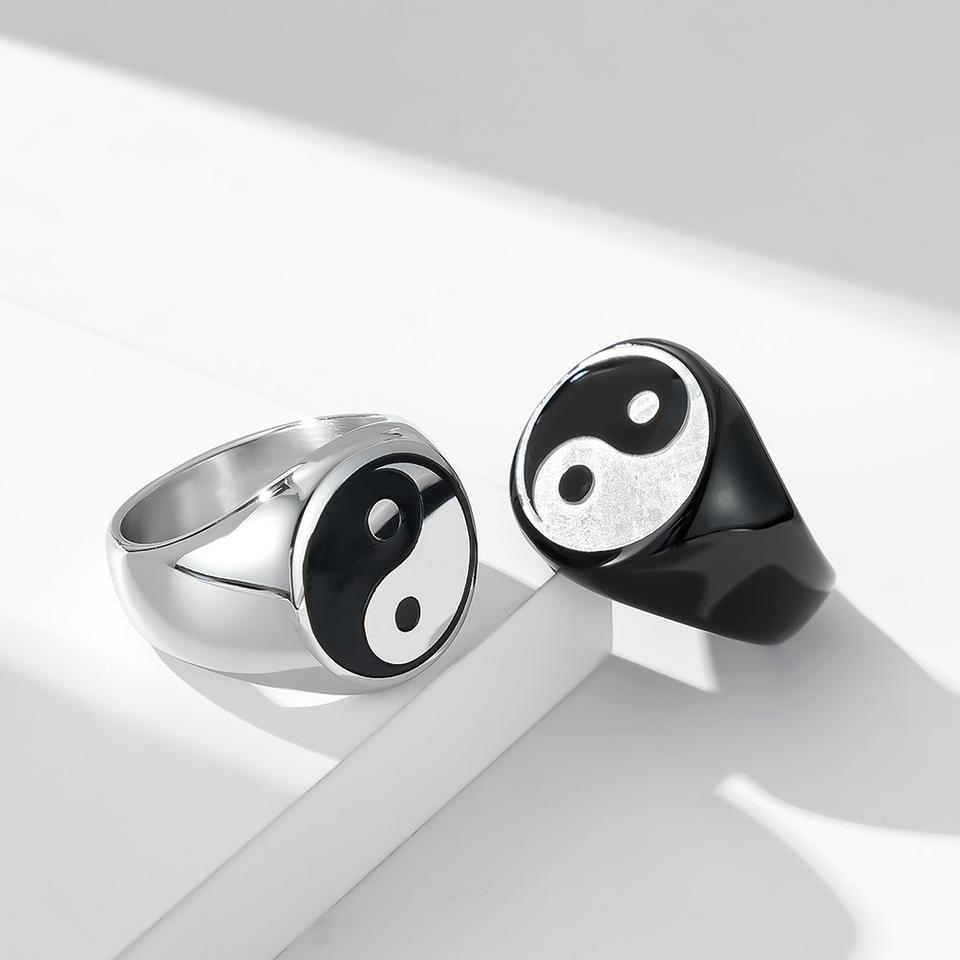 แผนภาพไทเก๊กสไตล์จีน แหวนผู้ชายเหล็กไทเทเนียม สัญลักษณ์หยินหยาง ของขวัญเครื่องประดับ สีดำ