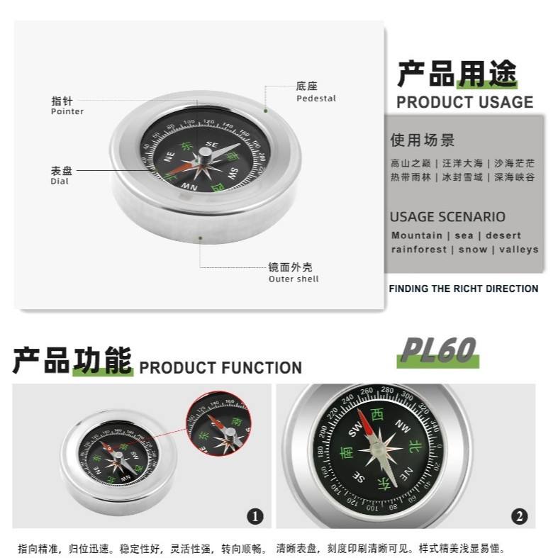เข็มทิศสแตนเลสแบบจีน 60 มม. สำหรับเดินป่ากลางแจ้ง พกพาสะดวก