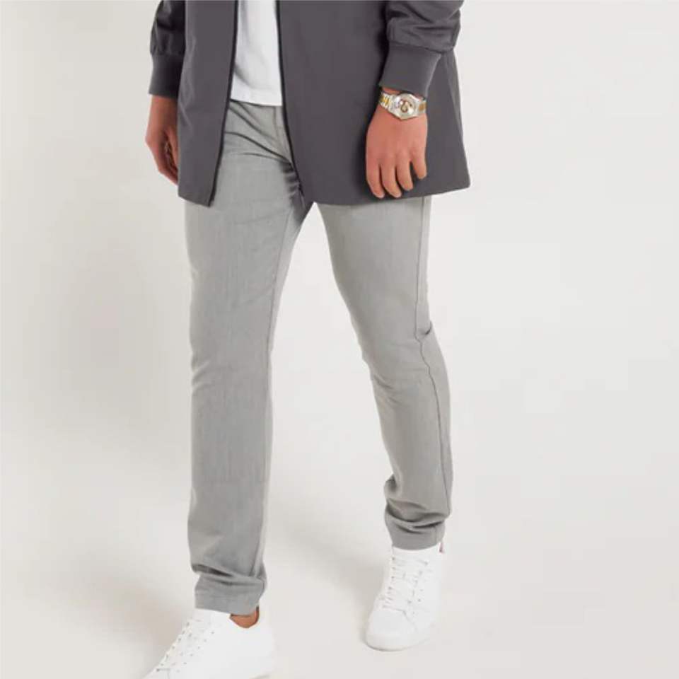 กางเกงชิโน่ทรงสลิมฟิต ปลายขาเรียวลงถึงข้อเท้า มีกระเป๋า ห่วงเข็มขัด หนังเทียม กันยับ สำหรับผู้ชาย สีพื้น ย้อมสีเรียบ