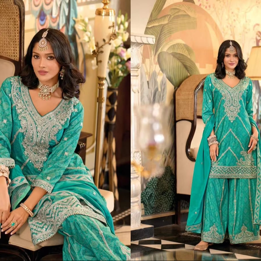Chinon plazo พิมพ์ดิจิตอลที่มีงานปักด้านหน้าและด้านหลังที่สวยงามเหมาะสำหรับงานเลี้ยงต้อนรับงานแต่งงานและพิธีแบบดั้งเดิม