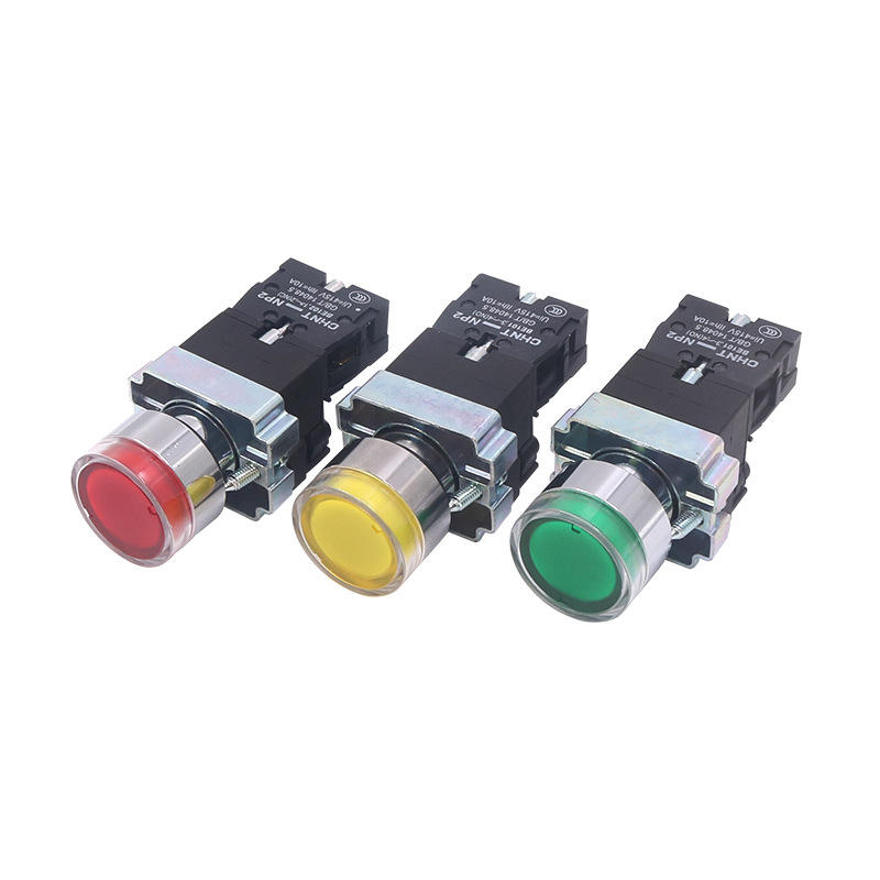 สวิตช์กดแบบมีไฟ Chint NP2-BW3 สแตนเลส 220V พร้อมแหล่งจ่ายไฟ 24V แบบกดติดปล่อยดับ ขนาด 22 มม. สีเขียว/แดง สตาร์ท 1A