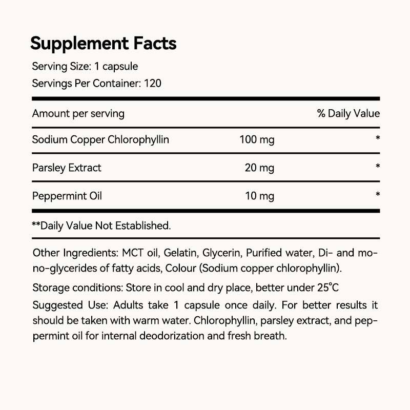 ส่วนผสมหลัก:โซเดียมคอปเปอร์คลอโรฟิลลิน, สารสกัดจากพาร์สลีย์, น้ำมันเปปเปอร์มินท์