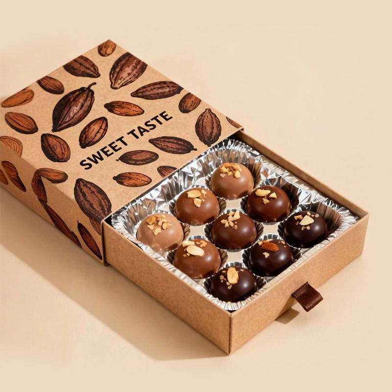 กล่องบรรจุภัณฑ์ช็อกโกแลตแบบกำหนดเอง กล่องของขวัญกระดาษแข็งแข็งแรงหรูหราพร้อมโลโก้สีทอง พร้อมตัวแบ่งช่องและกระดาษทิชชูสำหรับบรรจุอินทผลัมและถั่ว