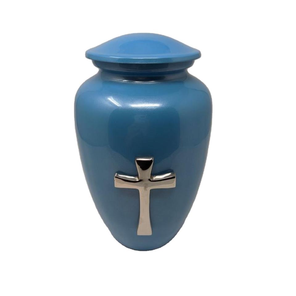 โกศและเหยือกใส่เถ้ากระดูกสีฟ้าสำหรับผู้ใหญ่โกศใส่เถ้ากระดูกและเหยือกสำหรับงานศพดีไซน์ไม้กางเขนคริสเตียนมาล่าสุด