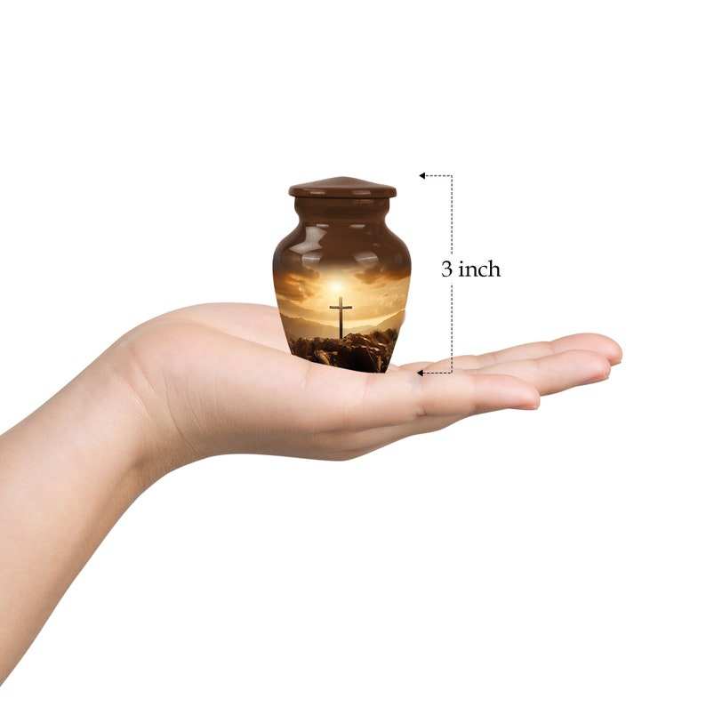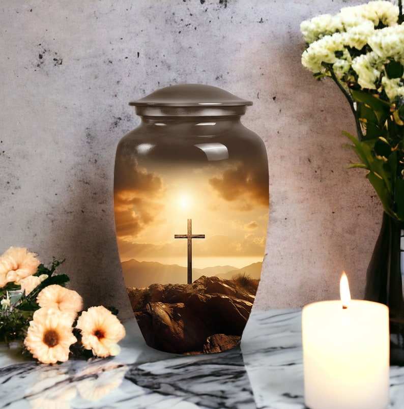สัญลักษณ์คริสเตียนโกศบ้านที่เร่าร้อนสำหรับขี้เถ้าของมนุษย์พระอาทิตย์ตกที่เงียบสงบพลบค่ำในพระคัมภีร์ไบเบิล
