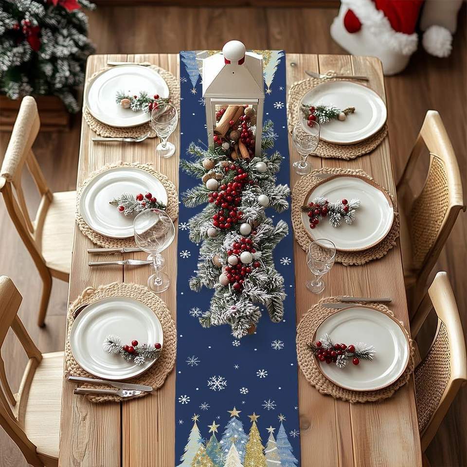 ผ้าปูโต๊ะคริสต์มาสขนาด 13x72 นิ้ว สไตล์ฟาร์มเฮาส์ ลายต้นคริสต์มาส เกล็ดหิมะ ของตกแต่งวันหยุด สำหรับตกแต่งโต๊ะครัว โต๊ะรับประทานอาหาร