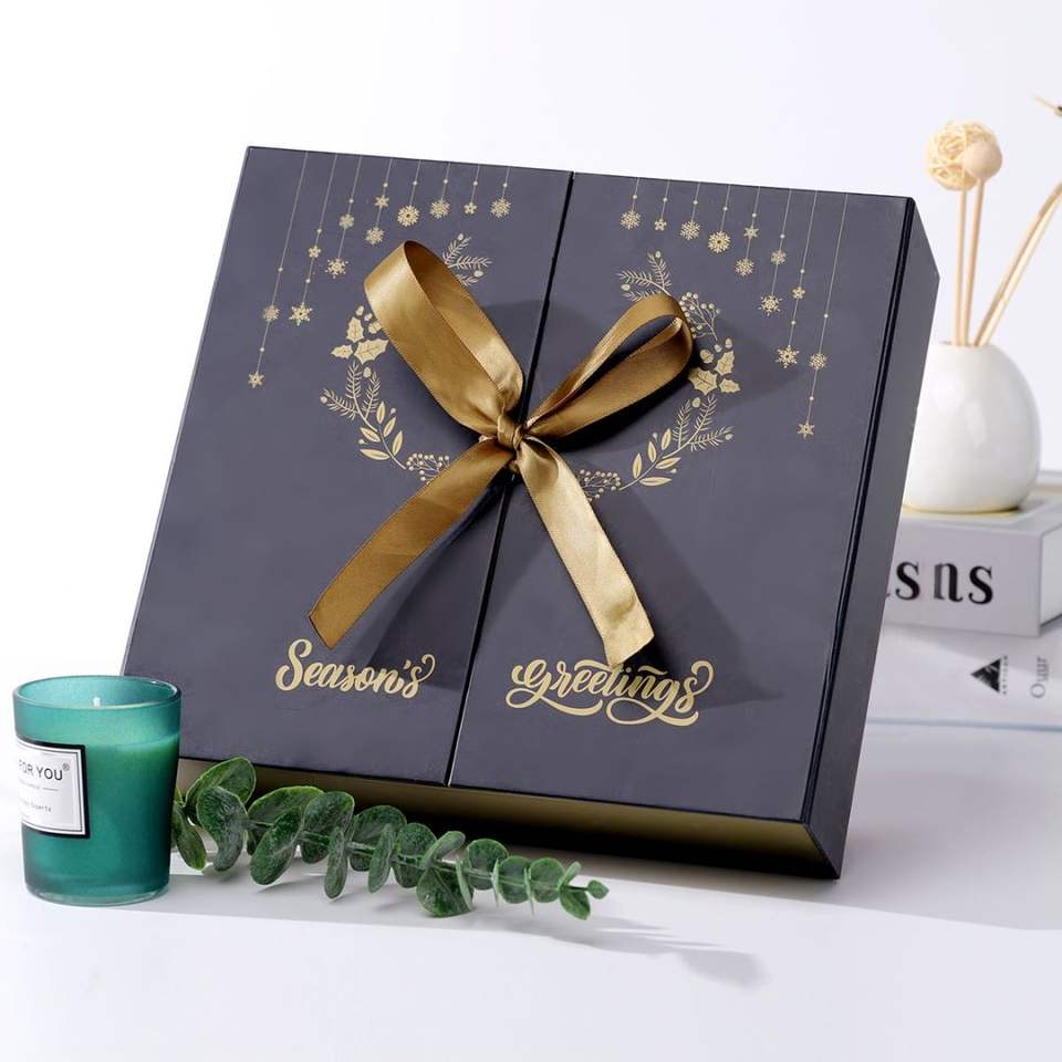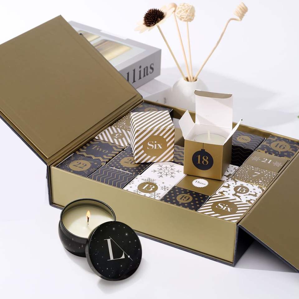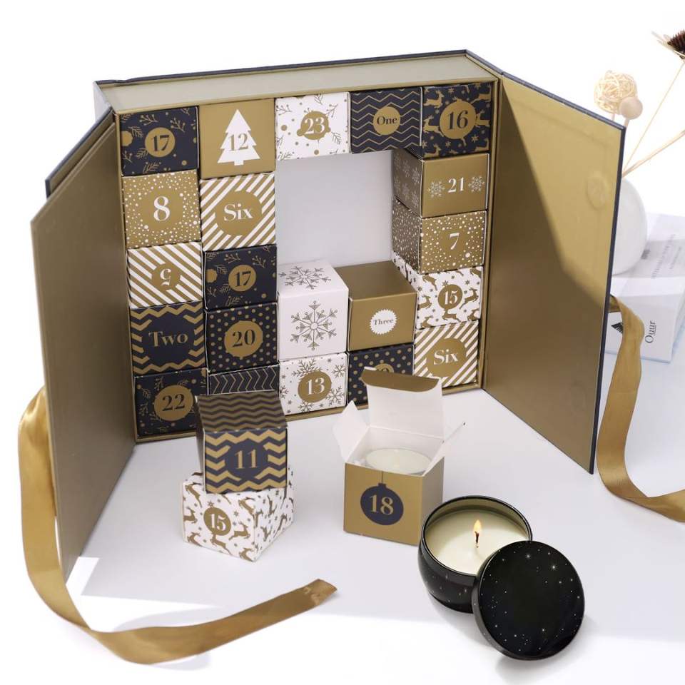 กล่องของขวัญคริสต์มาสปฏิทินช็อคโกแลตที่ว่างเปล่าบรรจุภัณฑ์ฟอยล์สีทองลายนูนเคลือบผิวหายไปพิมพ์ลาย