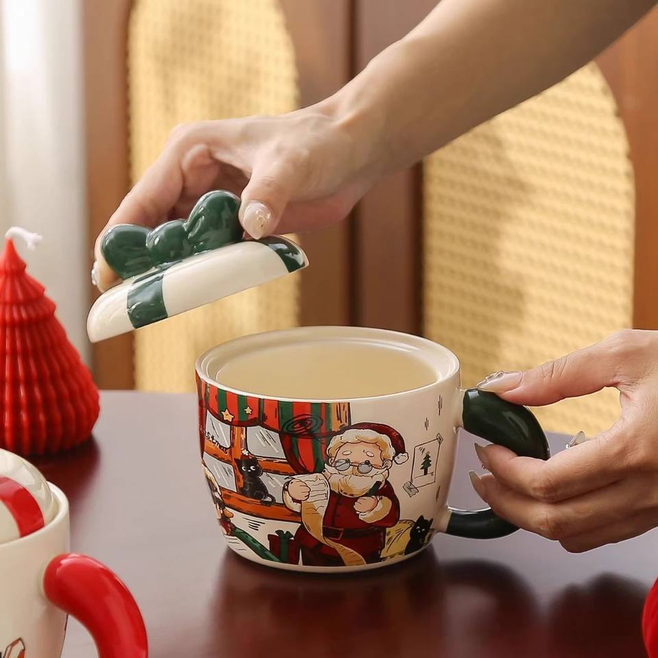 แก้วเซรามิคคริสต์มาสมีฝาปิด ลายการ์ตูนซานต้า ขนาด 12 ออนซ์ แก้วสำนักงาน สำหรับเป็นของขวัญวันหยุด