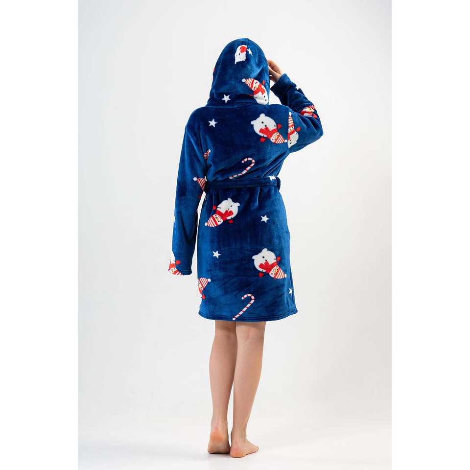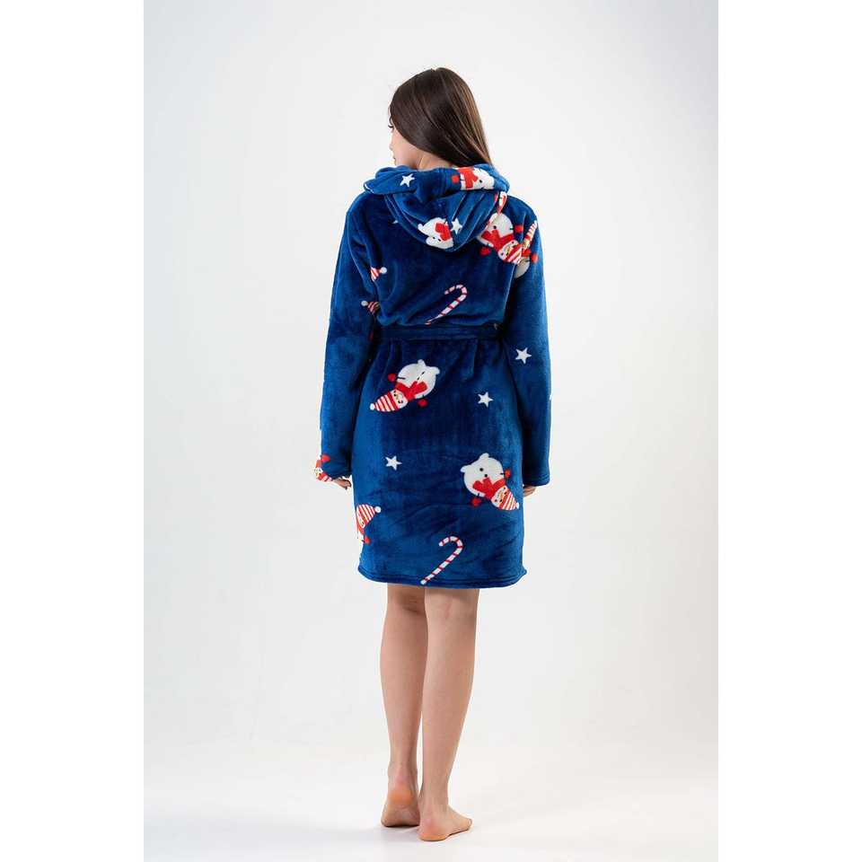 ชุดคลุมอาบน้ำผ้าฟลีซสำหรับผู้หญิง สีฟ้า มีฮู้ด แขนยาว เนื้อผ้านุ่ม ชุดนอนลำลอง ลายแมวและลูกกวาด