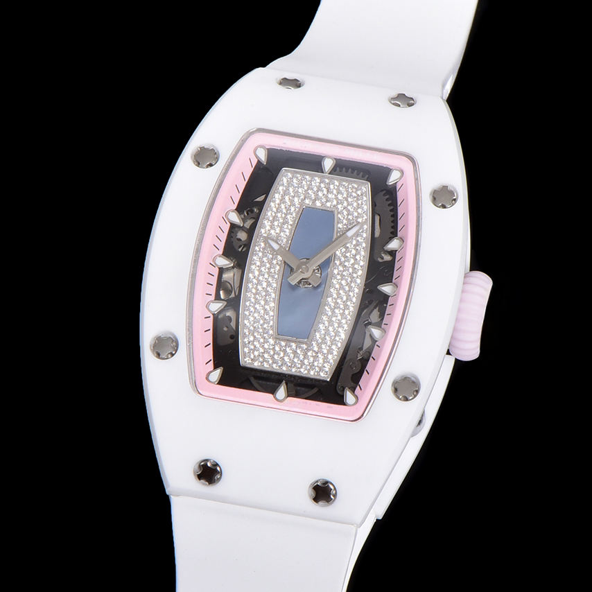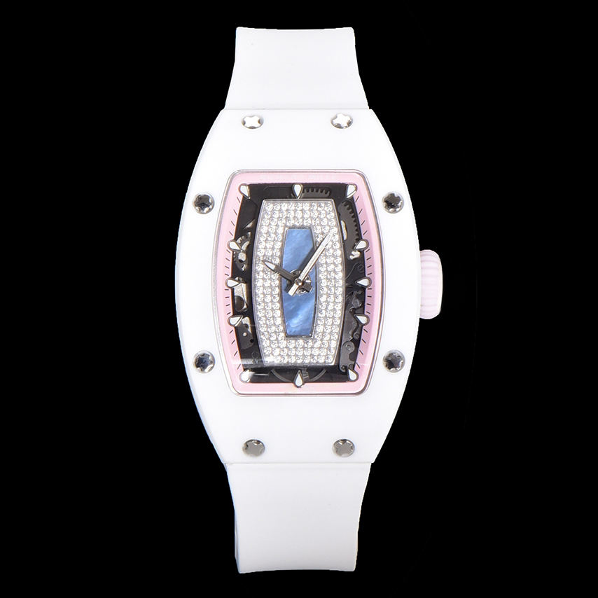 ของขวัญคริสต์มาส นาฬิกาข้อมือผู้หญิง นาฬิการูปทรงกระบอกสีขาว สายสีขาว หน้าปัดมุกสีน้ำเงิน ประดับเพชรเต็มเรือน นาฬิกาข้อมือแฟชั่นสุดหรู