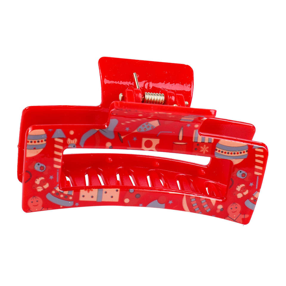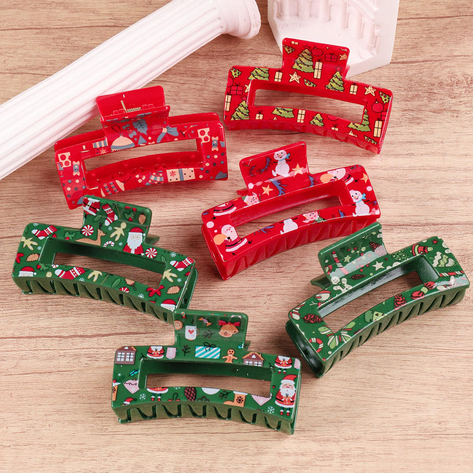 กิ๊บติดผมคริสต์มาส 8.5 ซม. ทรงสี่เหลี่ยม สีเขียว พิมพ์ลายโปร่ง กิ๊บพลาสติกพร้อมของตกแต่งสีแดงสำหรับเทศกาลวันหยุด