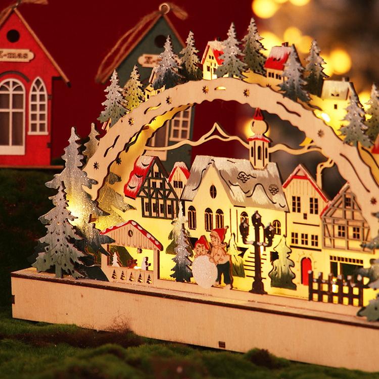 ซุ้มไฟ LED คริสต์มาส ลายเมืองเก่า ฉากคริสต์มาสฤดูหนาว ตัดด้วยเลเซอร์ หมู่บ้านคริสต์มาสไม้ 38x5x22 ซม. พิมพ์ลายซิลค์สกรีน