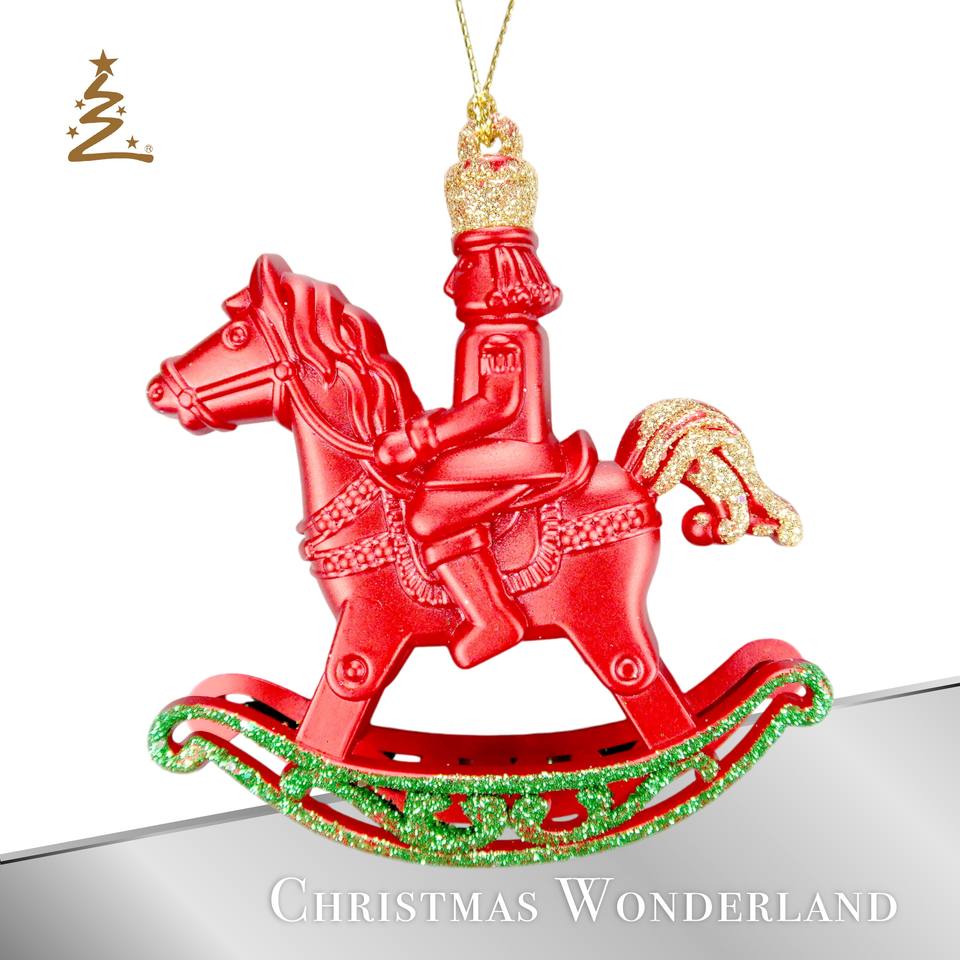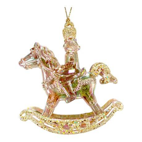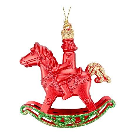 เครื่องตกแต่งคริสมาสต์ปีใหม่อะคริลิคสีแดงสีเขียวทองแวววาว3D เครื่องประดับม้าโยกของทหาร