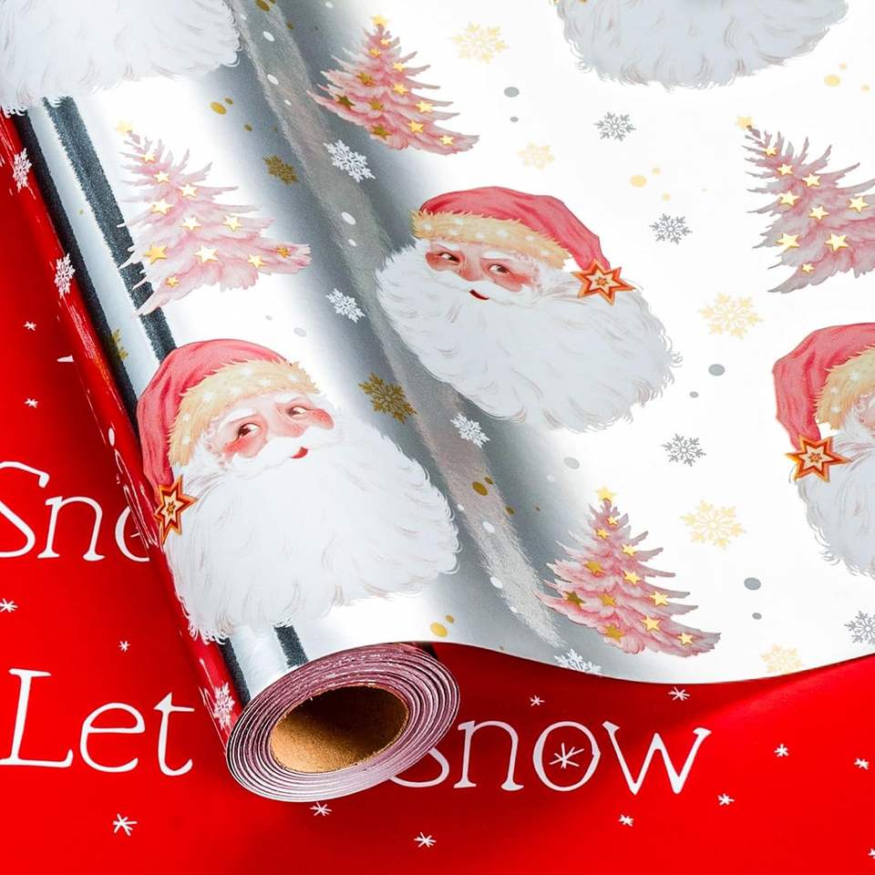 กระดาษห่อของขวัญลายคริสต์มาสแบบกลับด้านได้ สีเงินเมทัลลิก ลายซานต้า ต้นคริสต์มาส สีแดง ลาย Let It Snow ของตกแต่งวันหยุด