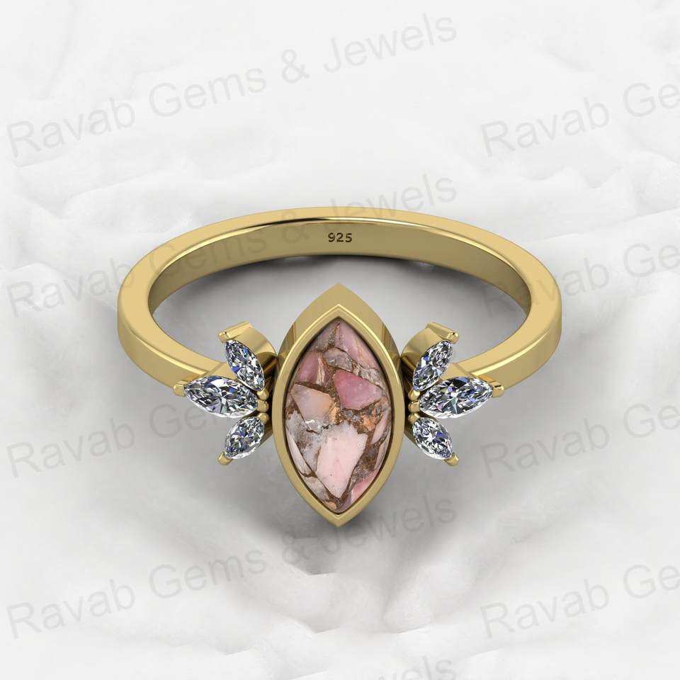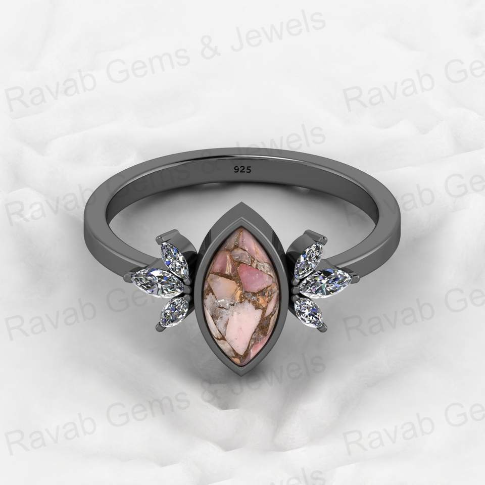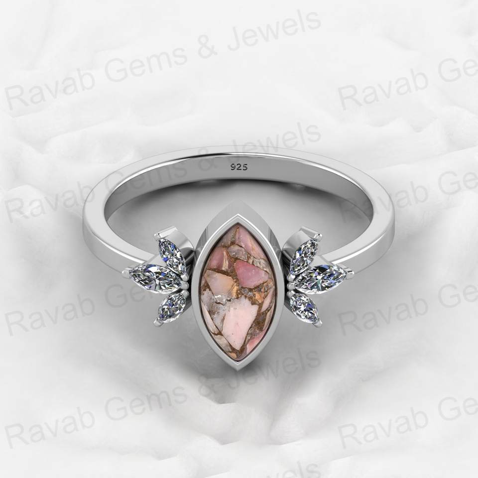 แหวนดีไซน์เนอร์ทรงมาร์คีส์ ลดราคาคริสต์มาส เงินแท้ 925 ประดับโอปอลสีชมพูและทองแดง ฝังแบบ Bezel Setting เครื่องประดับคุณภาพสูงสำหรับงานปาร์ตี้