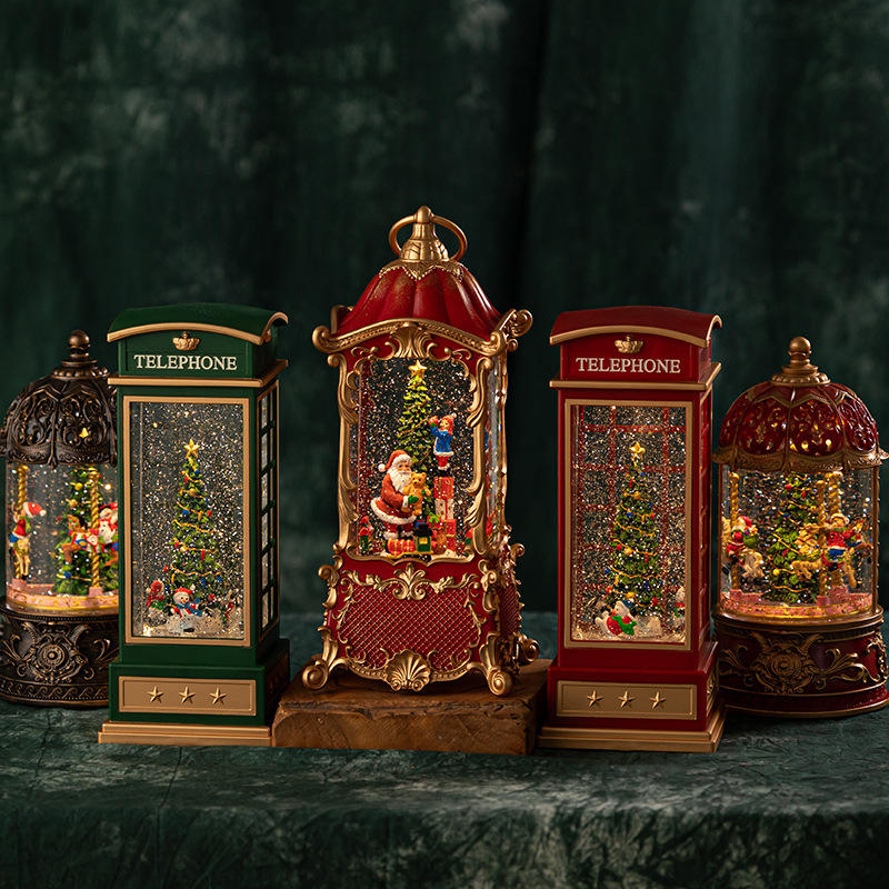 กล่องดนตรีลูกโลกหิมะคริสต์มาส - ตู้โทรศัพท์แบบอังกฤษ โคมไฟซานต้าพร้อมไฟ LED กลิตเตอร์หมุนวน และฟังก์ชั่นดนตรี