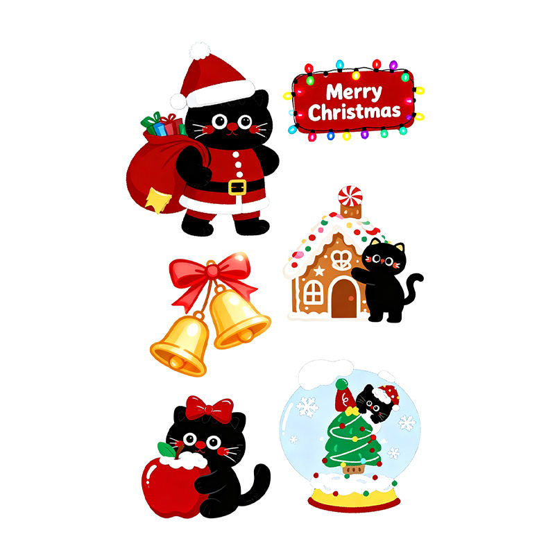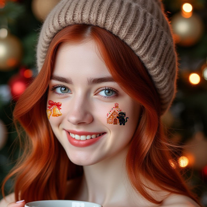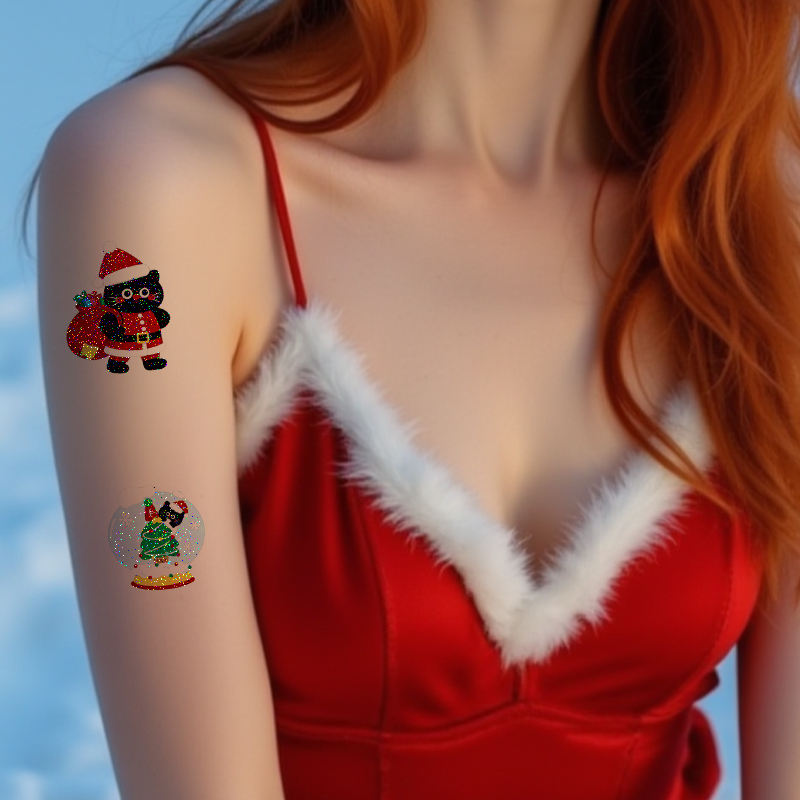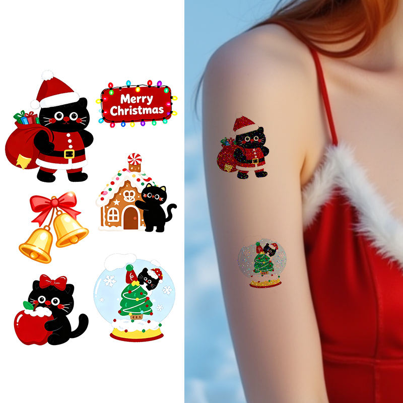 สติกเกอร์แทททูประดับกลิตเตอร์แบบชั่วคราวสำหรับเทศกาลคริสต์มาสรูปการ์ตูนขี้เล่นลายแมวเกล็ดหิมะกันน้ำสำหรับใบหน้าคอและแขน