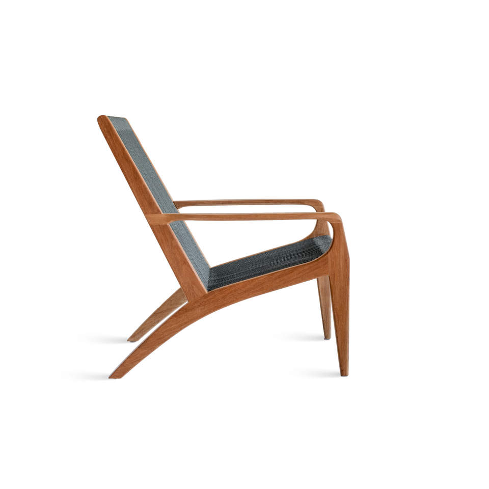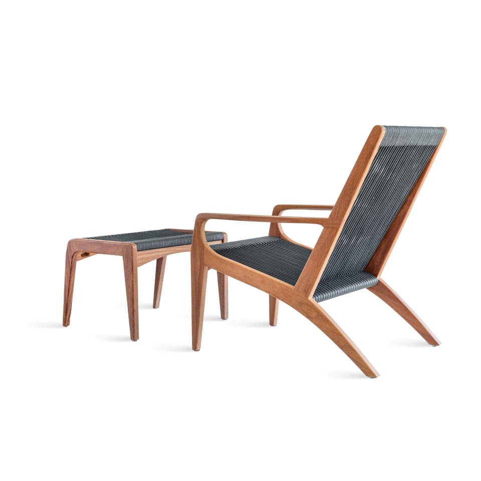 เก้าอี้พักผ่อนทรงโมเดิร์นรุ่นชุนดา ทำจากไม้สักแท้คุณภาพสูงและเชือกถัก พร้อมเคลือบผิววอลนัท สำหรับใช้งานในร่มและกลางแจ้ง