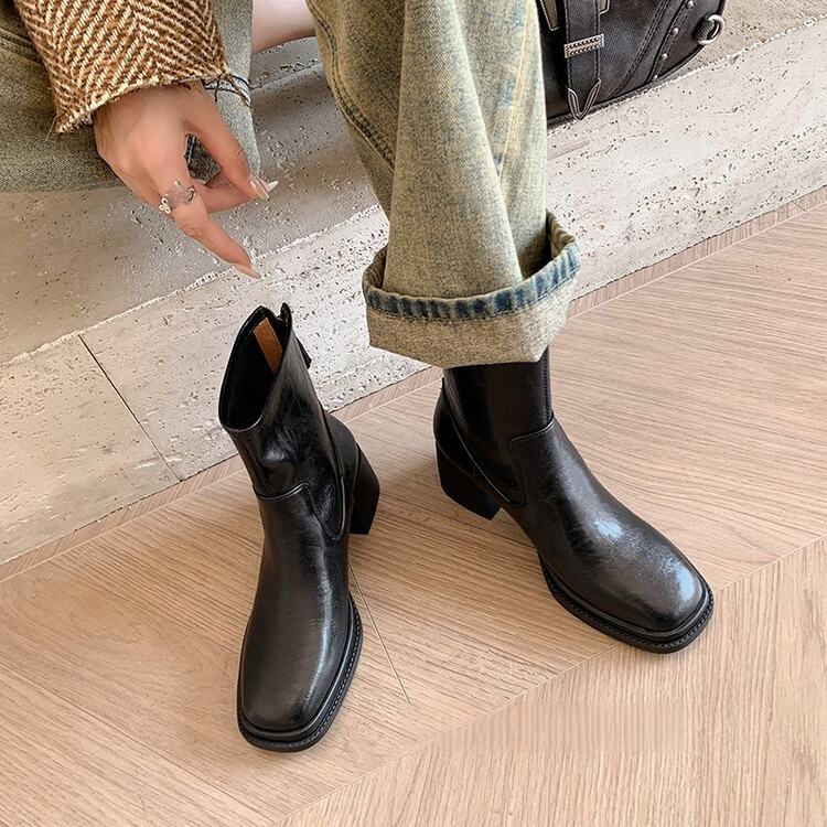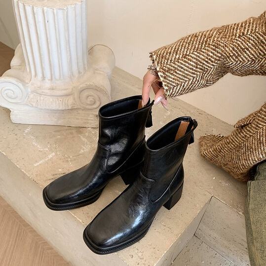 รองเท้าบูทหุ้มข้อส้นหนา หนังแท้ บุขนสัตว์ กระดุมติดสบาย ทันสมัย ใช้งานได้หลากหลาย สง่างาม ความยาวระดับกลางน่อง ทรงเพรียวบาง สำหรับฤดูใบไม้ร่วงและฤดูหนาว