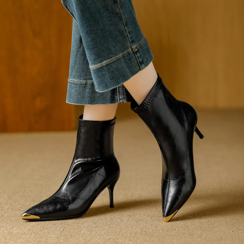 Chunky High Heeled Genuine Leather Ankle Boots-Fashionable Versatile Elegant Mid Calf Slim Comfort Boots for Autumn & Winter