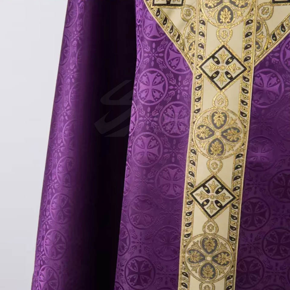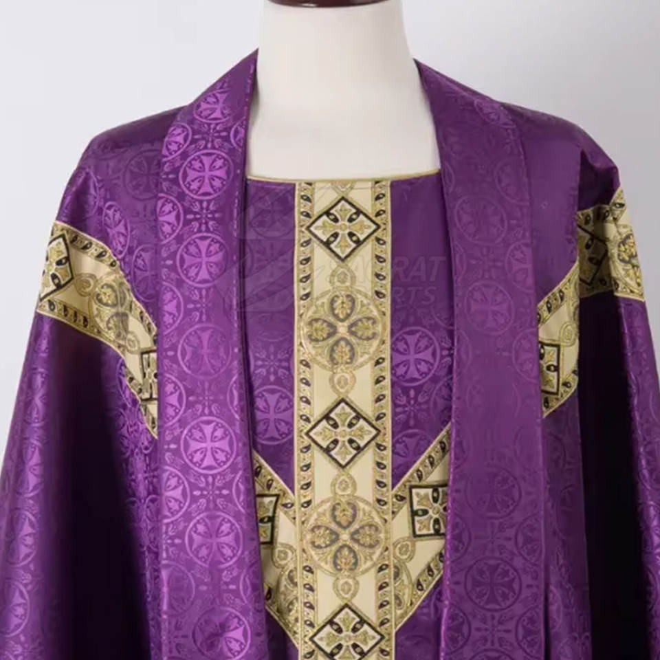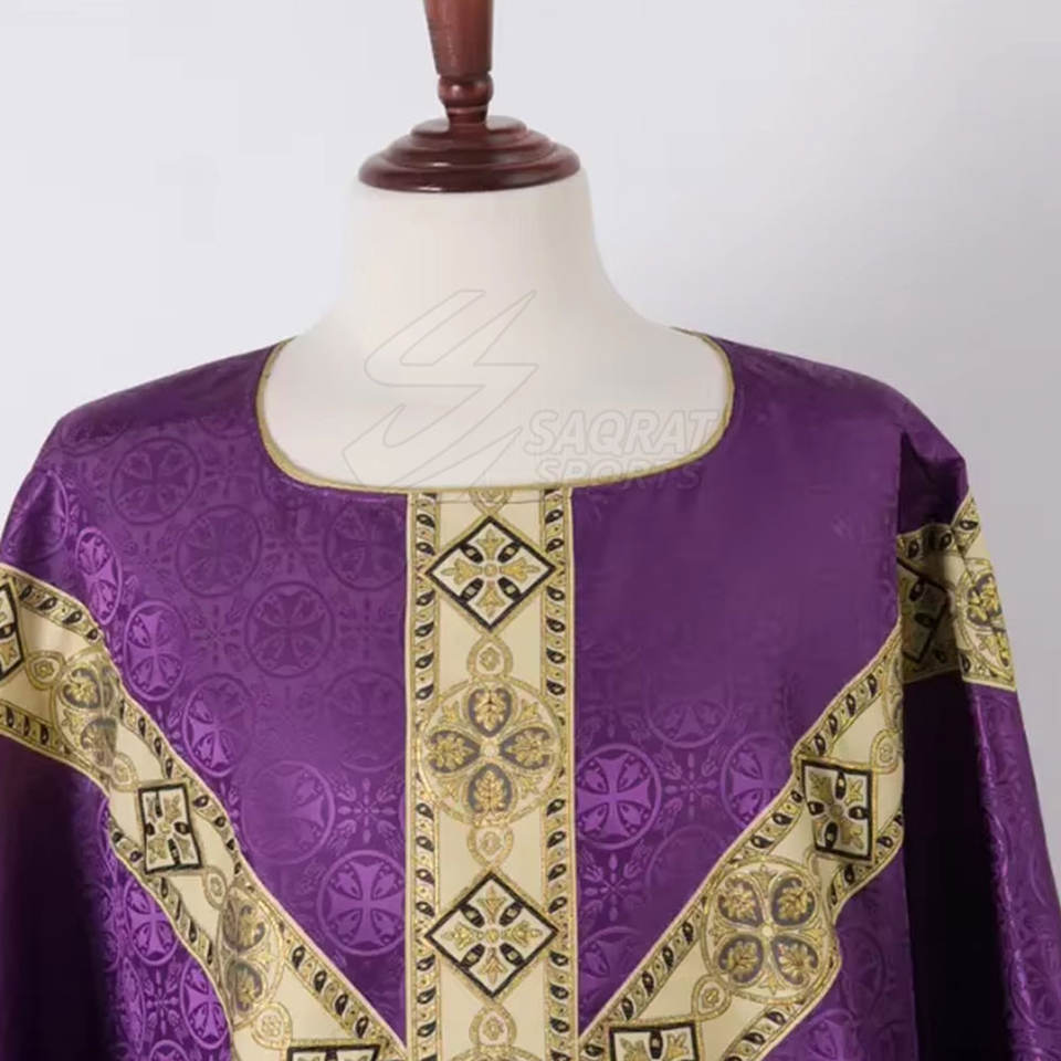 เสื้อคลุมของโบสถ์ที่มีแขนเสื้อและคอเสื้อตกแต่งด้วยผ้าซาตินและการตัดเย็บที่หรูหรา