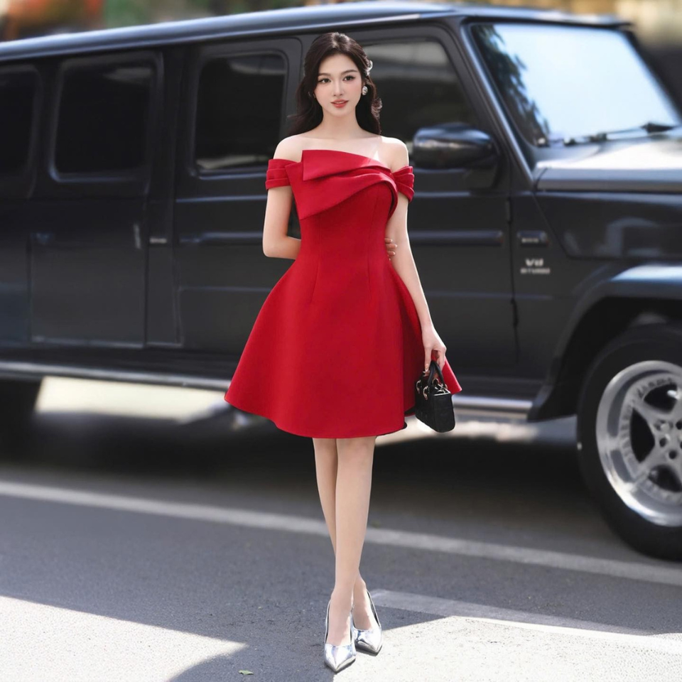 Cian ชุดเดรสทรงเอไลน์สีแดงแวววาวสำหรับผู้หญิงชุดเดรสมิดิหรูหราสำหรับผู้หญิงจากเวียดนาม