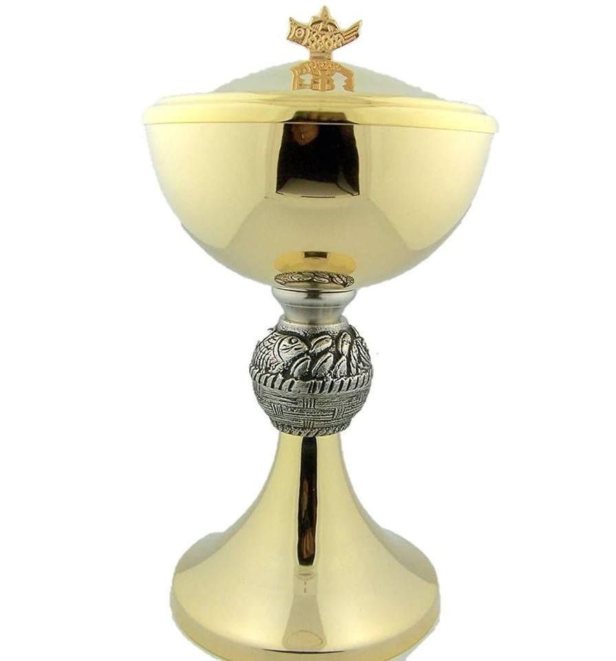 ถ้วยแก้วคริสตจักรทองเหลือง Ciborium พร้อมแผ่นทองเหลืองแกะสลักและนูนแบบกําหนดเอง OEM ถ้วยไวน์แบบกําหนดเองคุณภาพสูง