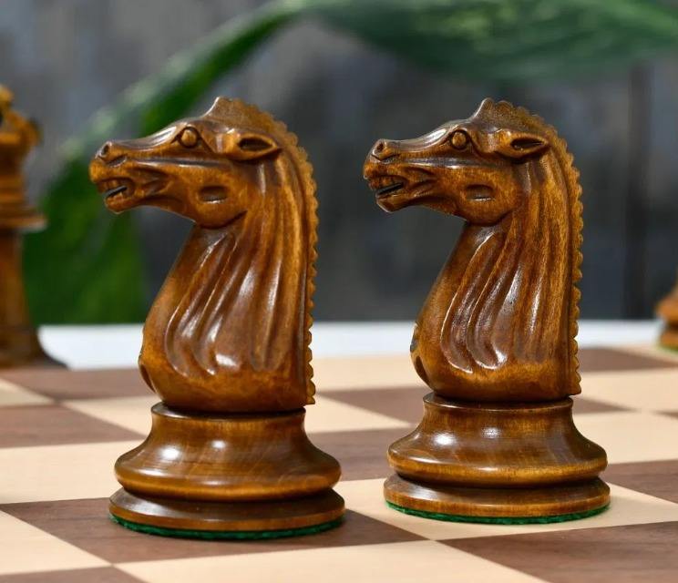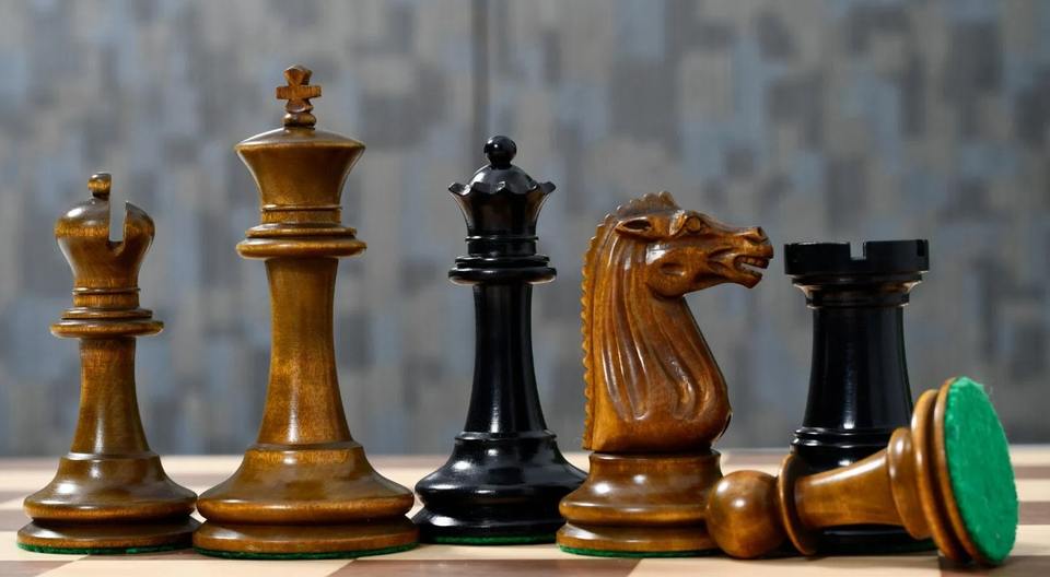 ชุดหมากรุกน้ำหนักถ่วงสไตล์โซเวียต-สตันตัน ยุคประมาณปี 1887 ทำจากไม้มะเกลือและไม้บ็อกซ์วูดโบราณ ความสูงของราชา 4 ซม. ราคาดีที่สุด