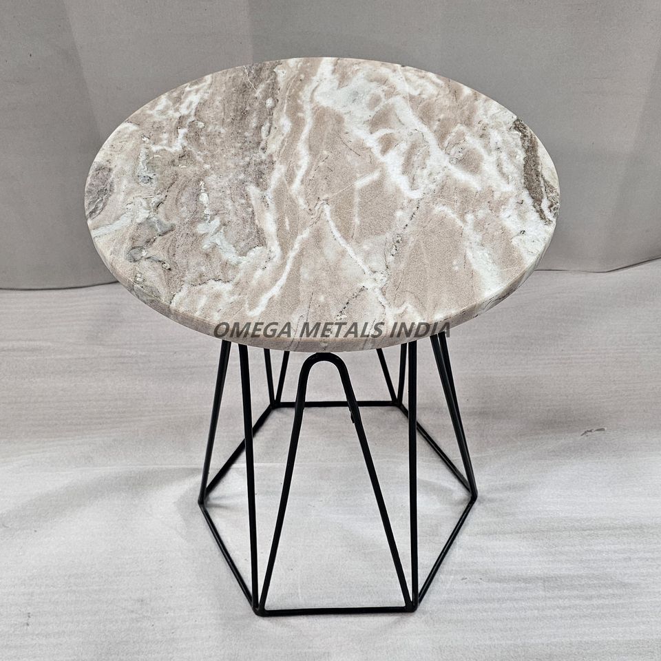 โต๊ะด้านข้างทรงกลมมีด้านบนสีเบจหินธรรมชาติและฐานโครงลวดเหล็กสีดำเงาที่สมบูรณ์แบบสำหรับพื้นที่อยู่อาศัย