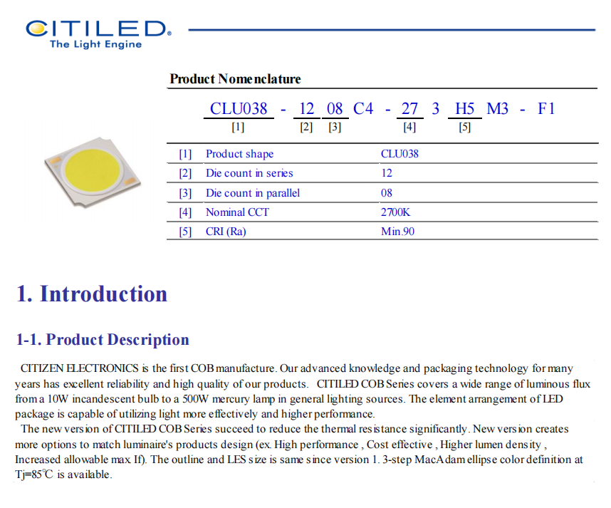 ชิป LED COB กำลังสูง สีขาว 3000k 4000k รุ่น Citizens CLU038-1208C4-303H5M3-F1 ค่า CRI 90 ปรับความสว่างได้ 34V รับประกัน 1 ปี
