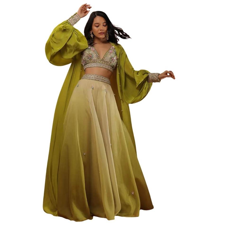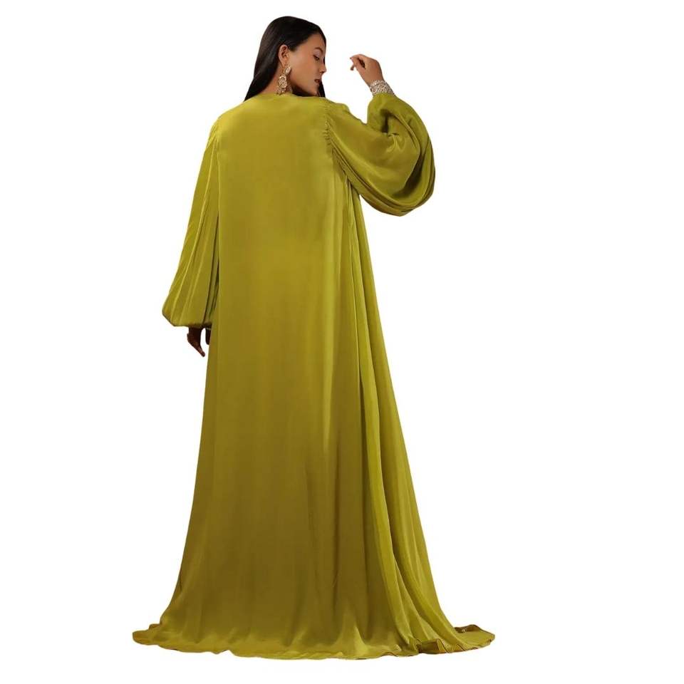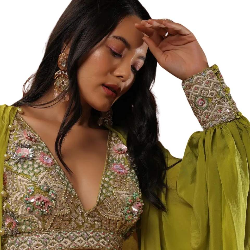 ชุดพาลาซโซสีเขียวส้มพร้อมผ้าคลุมและปักลายเสื้อผ้าพื้นเมืองสำหรับผู้หญิงเครื่องแต่งกายงานปาร์ตี้ตามสั่ง