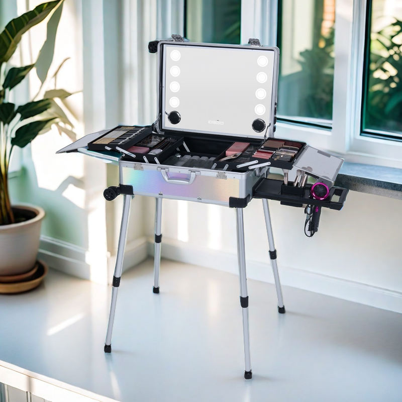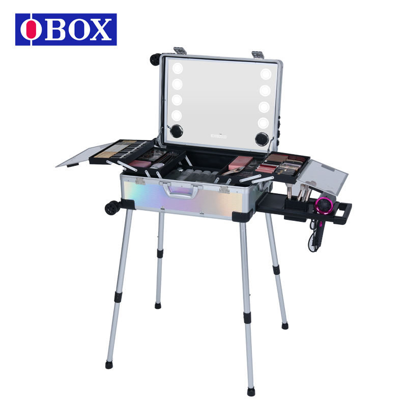 Clad Plate Trolley Makeup Box Cosmetic case Can Do OEM/ODM With 8 LED Light with Bluetooth Music Play for Makeup Artist Studio