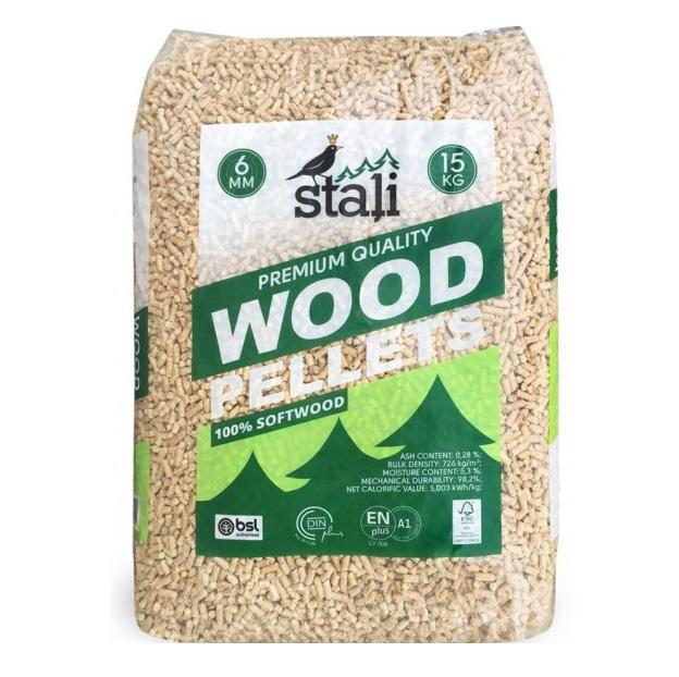 เม็ดไม้สนและเฟอร์เกรด A1 ขนาด 6 มม. มาตรฐาน DIN+ Plus และ ENplus A1/A2 (ได้รับการรับรองจาก BSL เถ้า 1.5% ความชื้น 5% ในถุงขนาด 15 กก.)