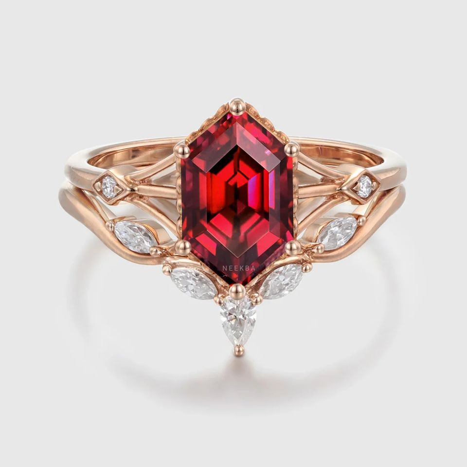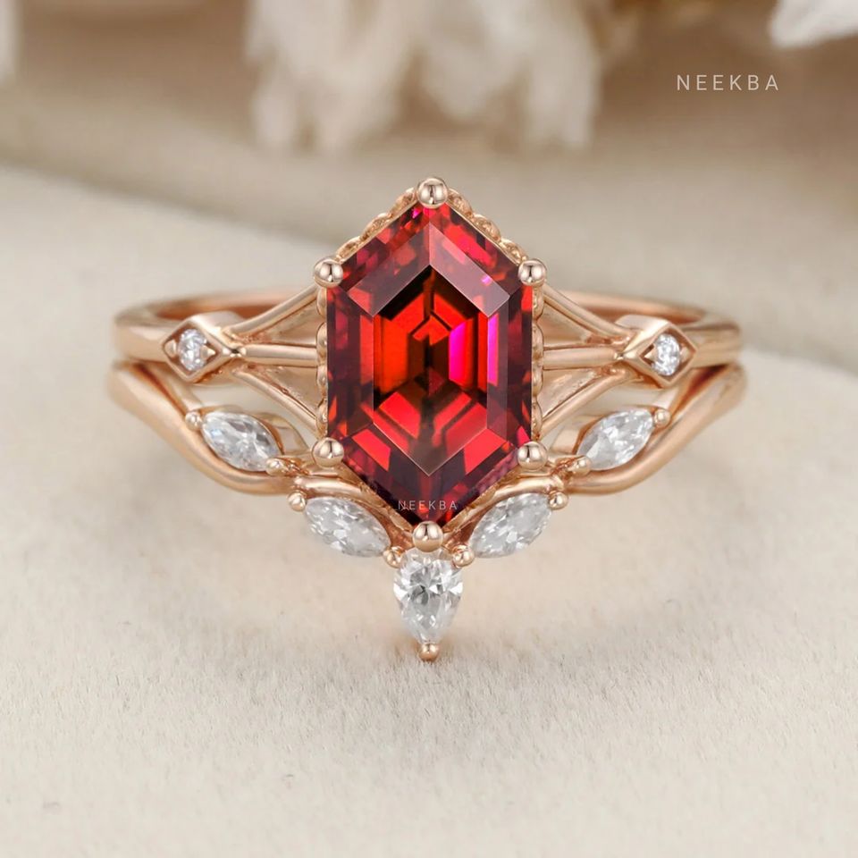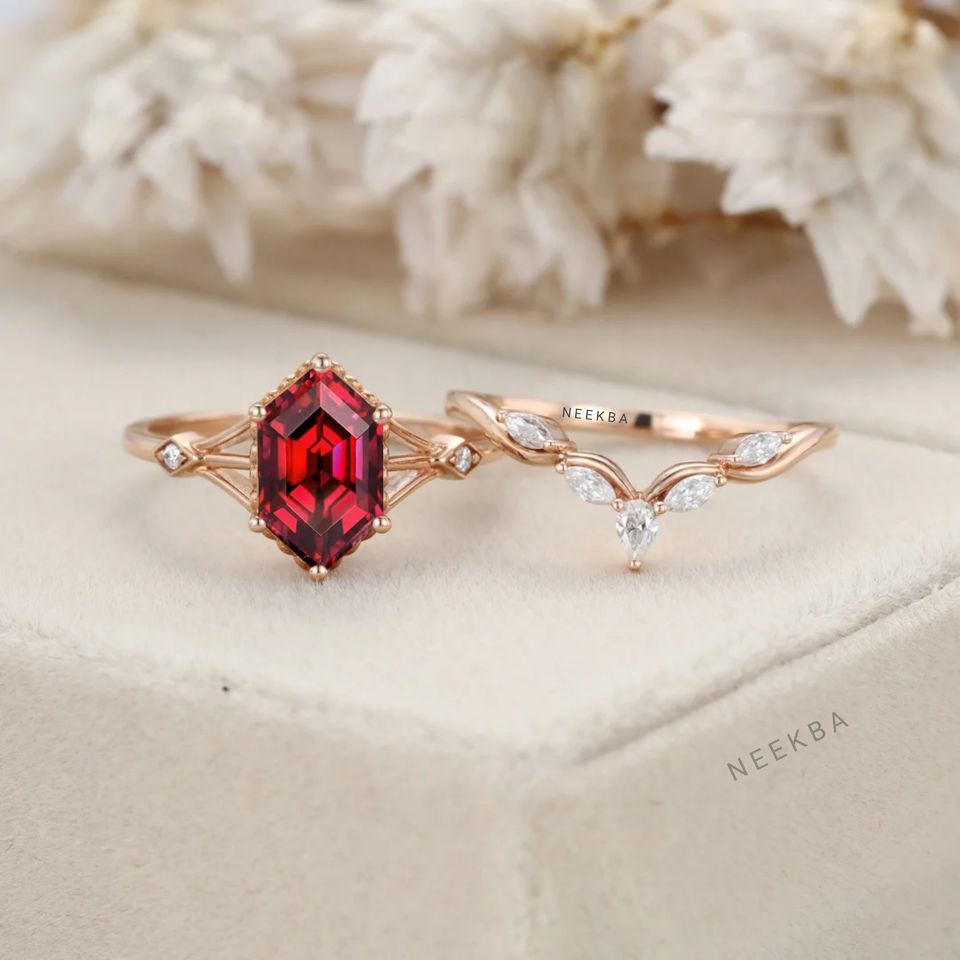 ชุดแหวนเจ้าสาวสไตล์อาร์ตเดคโคสีโรสโกลด์แข็ง10K แหวนแต่งงานทับทิมตัดทรงหกเหลี่ยมมีสายคาด