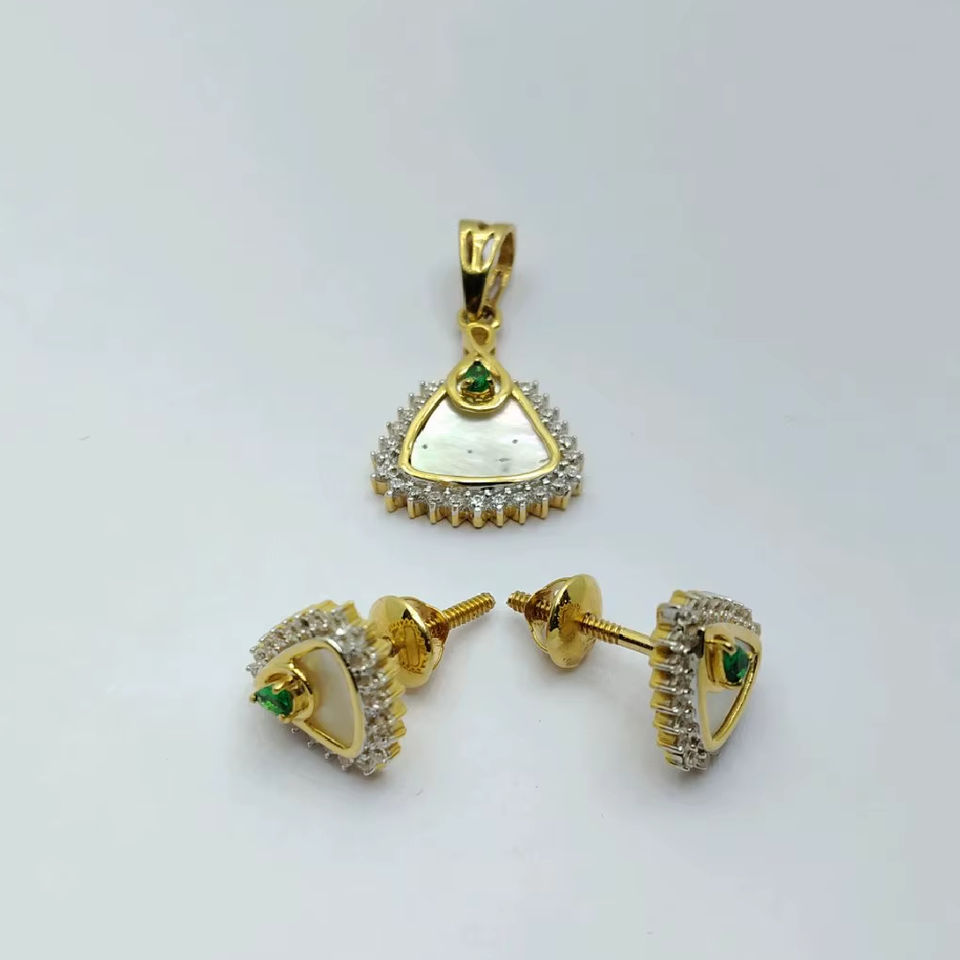 ต่างหูแบบติดหูทรงสามเหลี่ยมทองคำ 22K ดีไซน์คลาสสิก พร้อมชุดจี้เข้าชุด ประดับมุกและพลอยสีเขียว สวยสง่างามสำหรับผู้หญิง