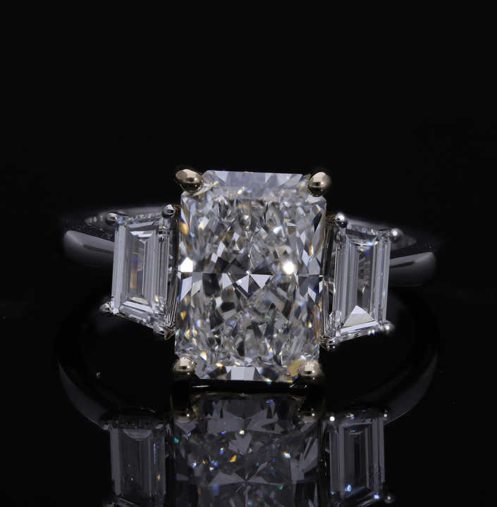 แหวนหมั้นและแหวนครบรอบสำหรับผู้หญิง ดีไซน์คลาสสิก ประดับเพชร 3 เม็ด ทรงเรเดียนท์คัท 3 กะรัต และเพชรทรงสี่เหลี่ยมคางหมู 0.7 กะรัต ผลิตด้วยเทคนิค Lab Grown ตัวเรือนทองคำแท้ 14K ชุบโรเดียม