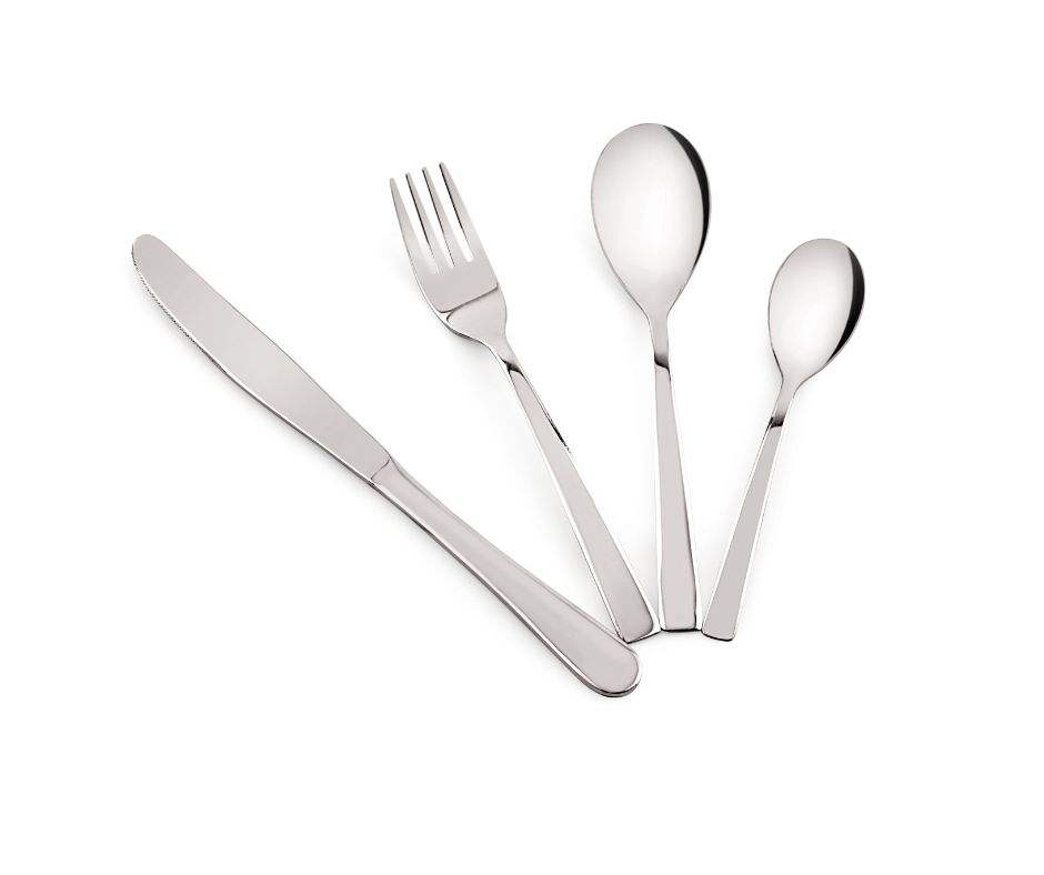 ชุดช้อนส้อมสแตนเลสสตีลขัดเงาแบบคลาสสิก 4 ชิ้น เป็นมิตรกับสิ่งแวดล้อม ประกอบด้วยมีดทานอาหาร ส้อม ช้อน และช้อนชา