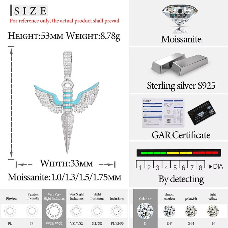 จี้ S925สไตล์เรืองแสงมีปีกนางฟ้าแบบคลาสสิกสำหรับผู้ชายและผู้หญิงโซ่คิวบาพร้อมจี้เพชรโมอิสซานไนต์