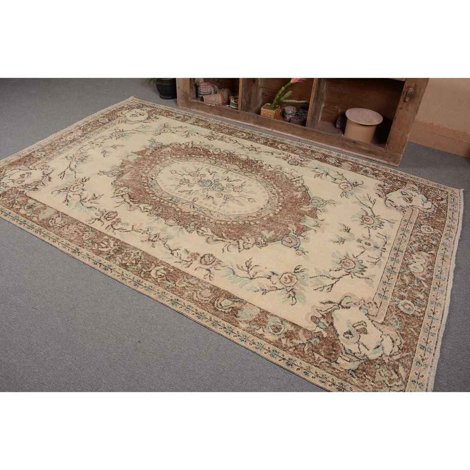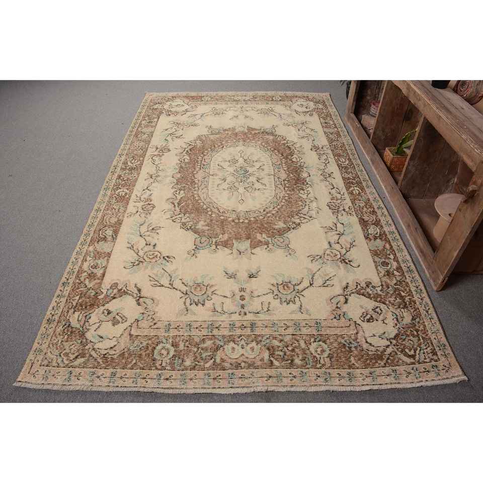 พรมขนสัตว์ตุรกีโบราณสีเบจสีน้ำตาลขนาด5.5x9ฟุตพรมลาเท็กซ์สำหรับห้องนอนทางเดิน
