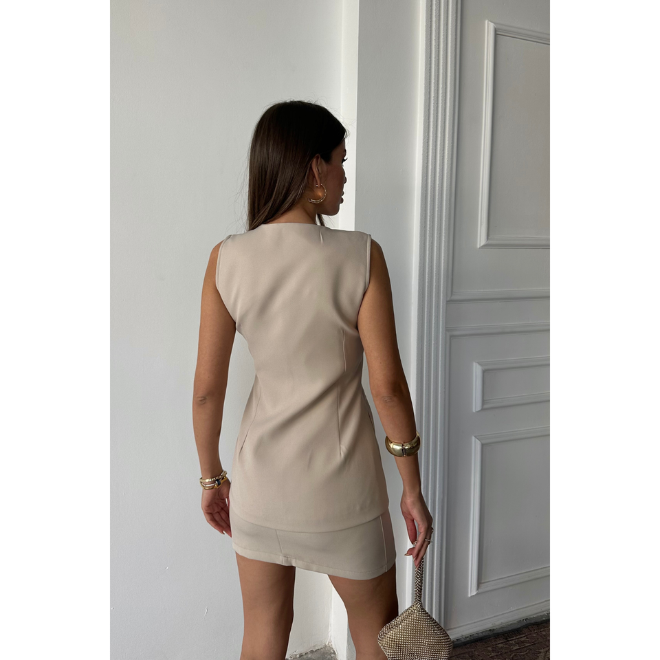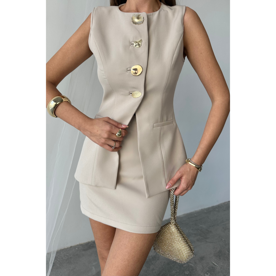 ชุดเดรสลำลองสีเบจคลาสสิก - ชุดกระโปรงสั้นติดกระดุมสีทองพร้อมเสื้อกั๊กที่สวมใส่สบาย