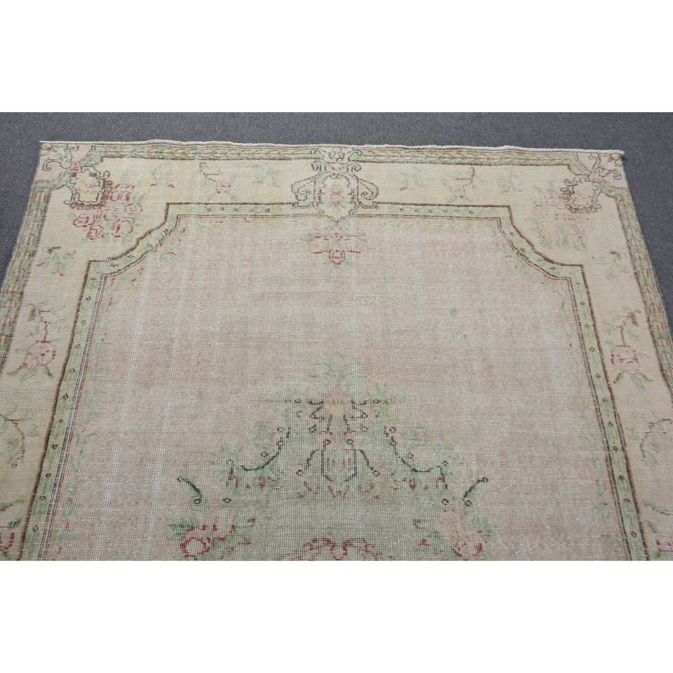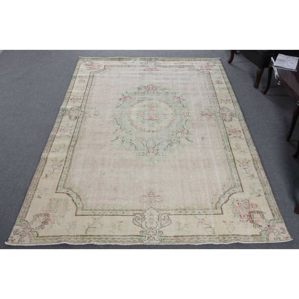 พรมขนสัตว์แบบดั้งเดิมสีเบจเขียวคลาสสิก ขนาด 6.4 x 9.6 ฟุต เป็นมิตรกับสิ่งแวดล้อม ดีไซน์แบบออบูซองตุรกี ลายปะติดปะต่อ ทำจากยางลาเท็กซ์ เหมาะสำหรับห้องรับประทานอาหาร
