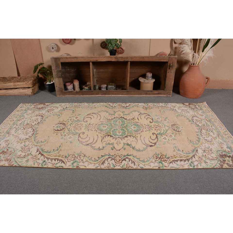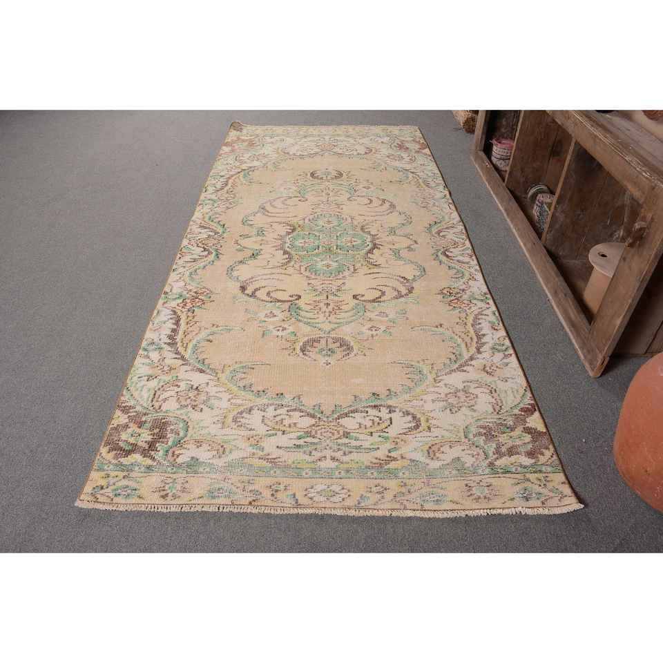 พรมตุรกีโบราณสีเบจสีเขียวแบบคลาสสิก4.2 x 9ft การเย็บปะติดปะต่อกันด้วยผ้าขนสัตว์ลาเท็กซ์สำหรับห้องโถงห้องนอนพรมข้างเตียง