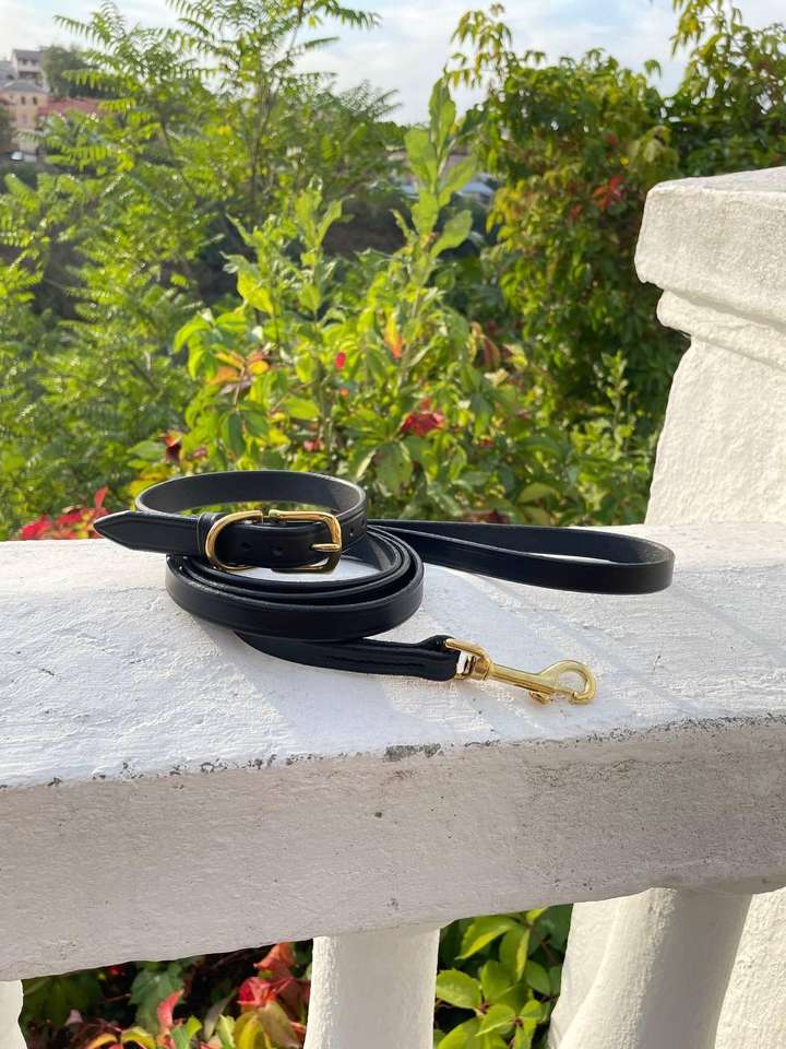 ชุดปลอกคอสุนัขหนังสีดำคลาสสิกพร้อมกระดุมทองเหลืองสำหรับสุนัขขนาดเล็กและขนาดกลาง
