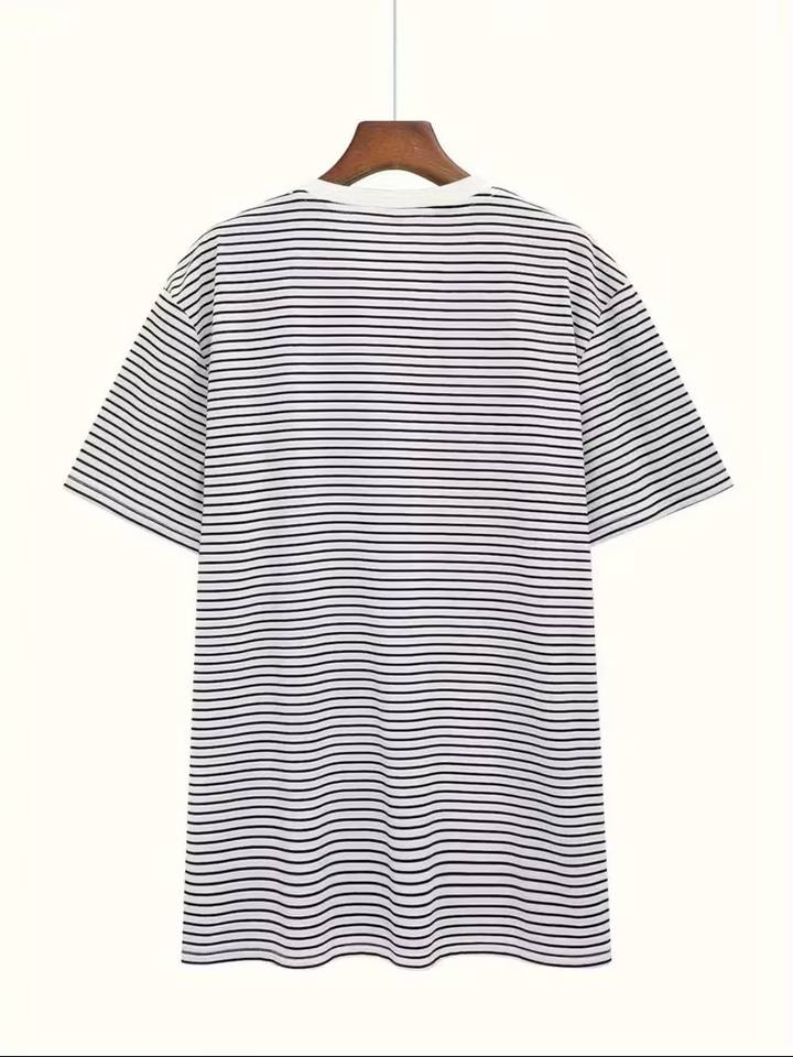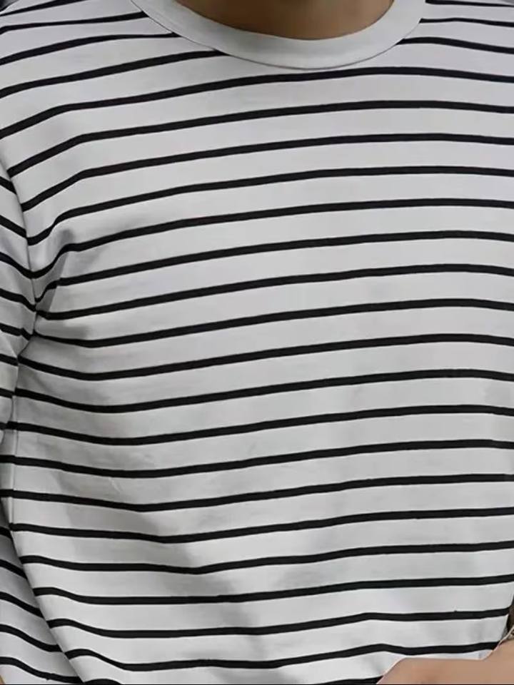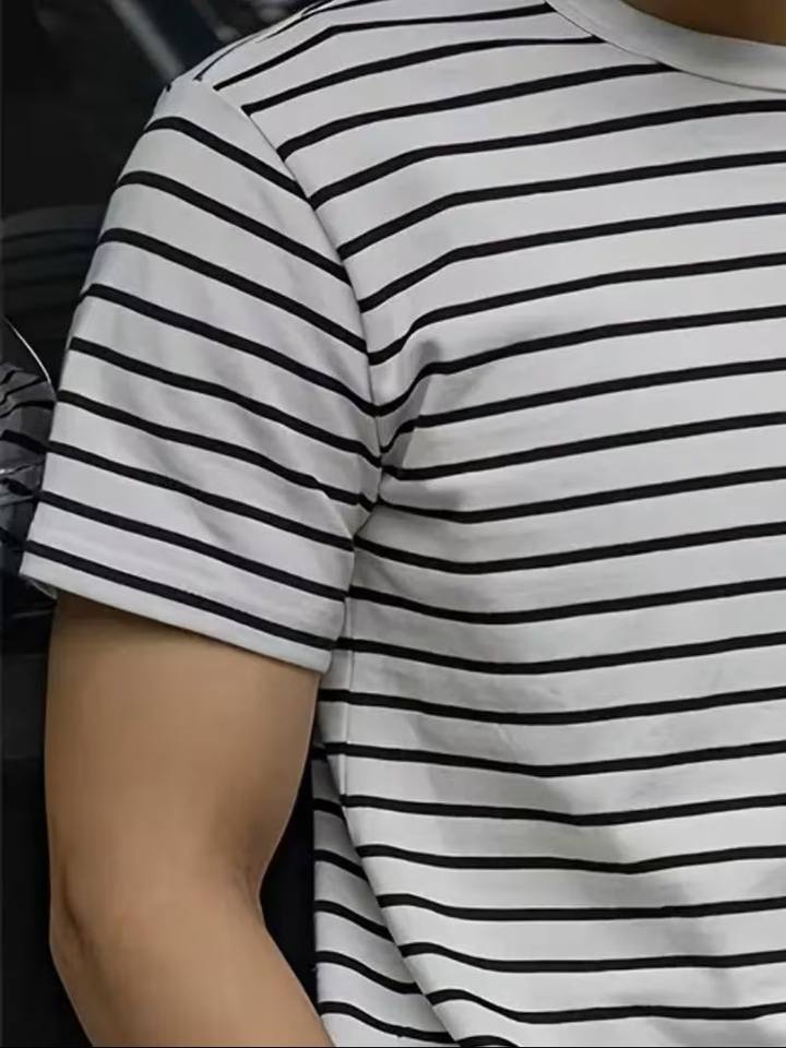 เสื้อยืดคอกลมแขนสั้นผู้ชายลายทางขาวดำคลาสสิก ดีไซน์มินิมอลทันสมัย ผลิตจากโพลีเอสเตอร์/คอตตอน แห้งเร็ว