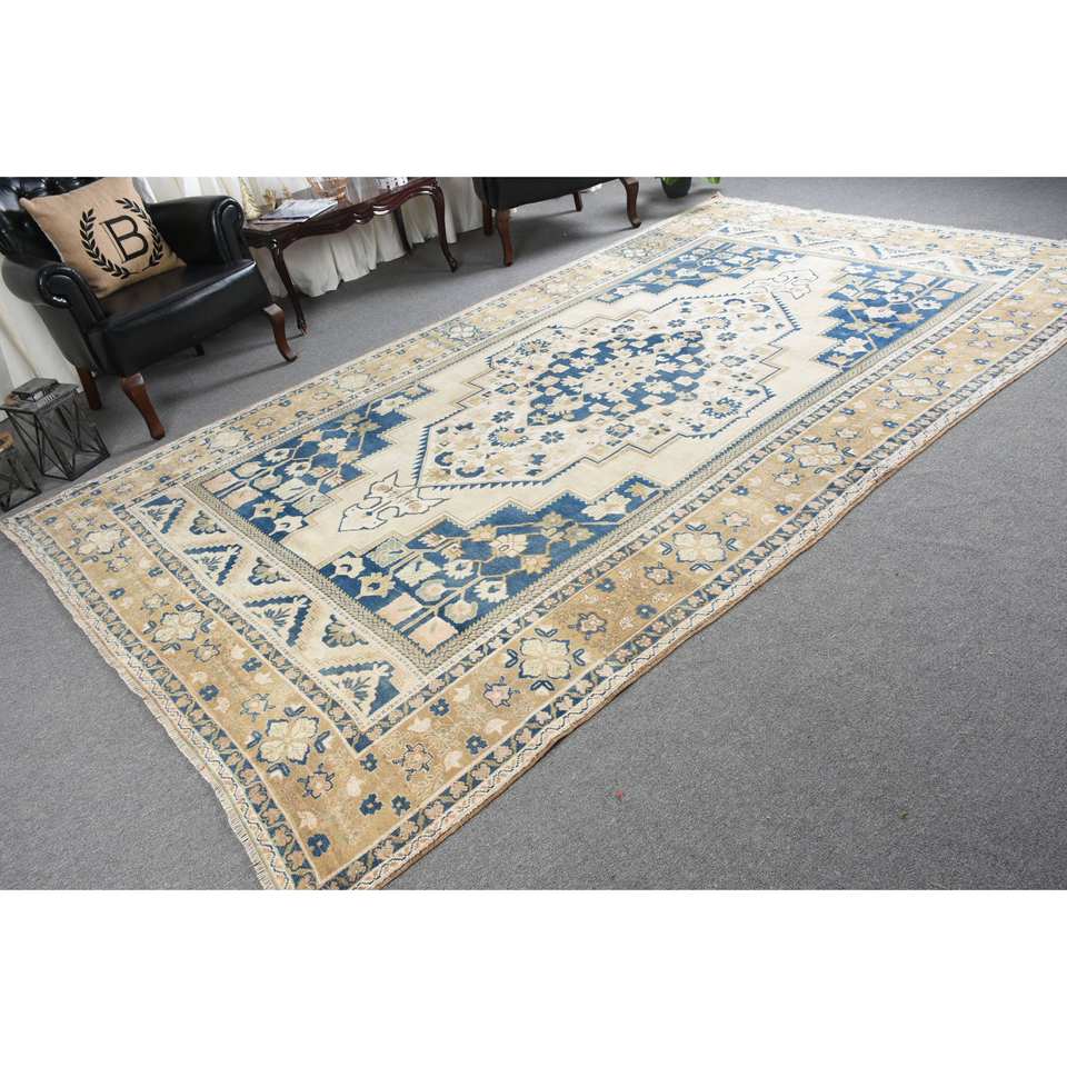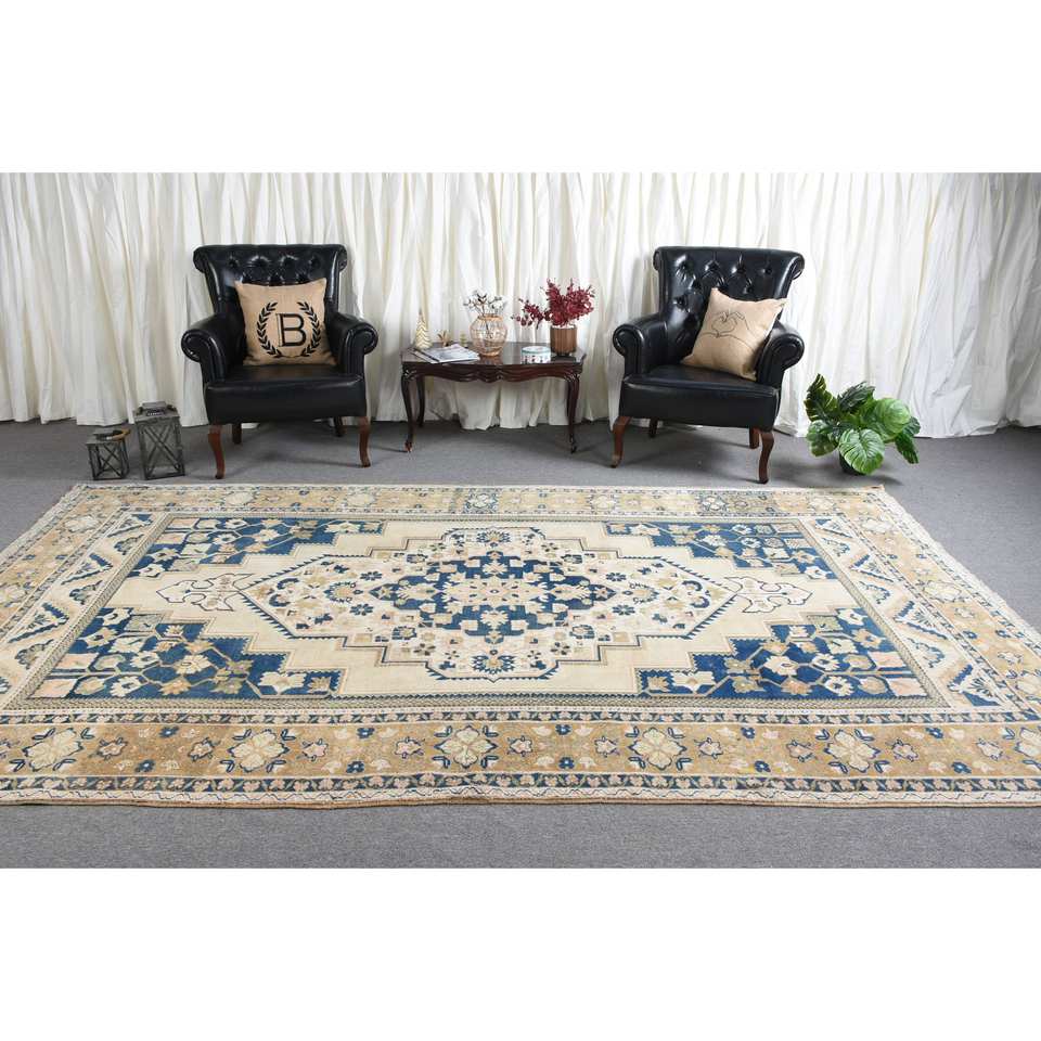 พรมโพลีเอสเตอร์ทำมือสีฟ้าเบจสีฟ้าคลาสสิกความสูงกองกำมะหยี่สี่เหลี่ยมผืนผ้า6.9x11.5ฟุตสำหรับห้องนั่งเล่นหรือห้องนอน