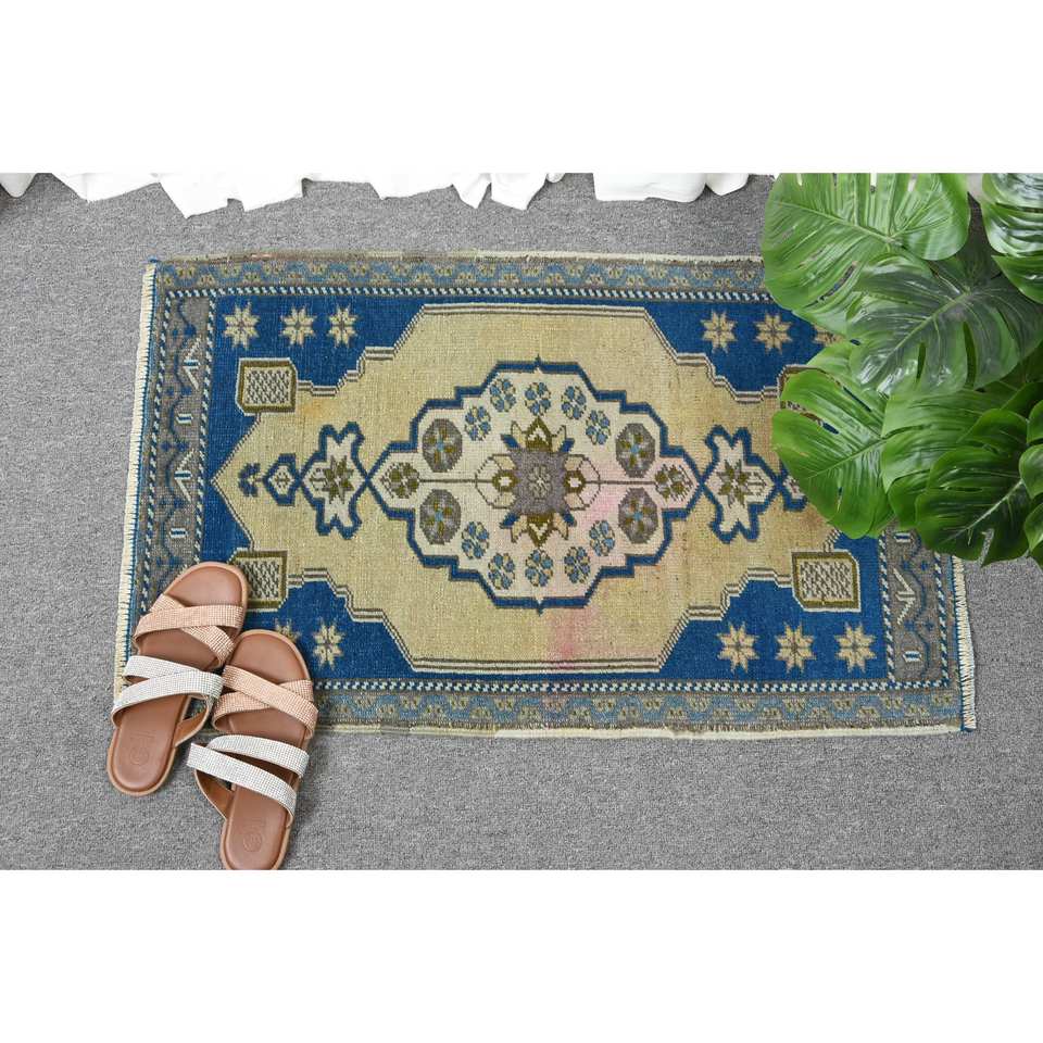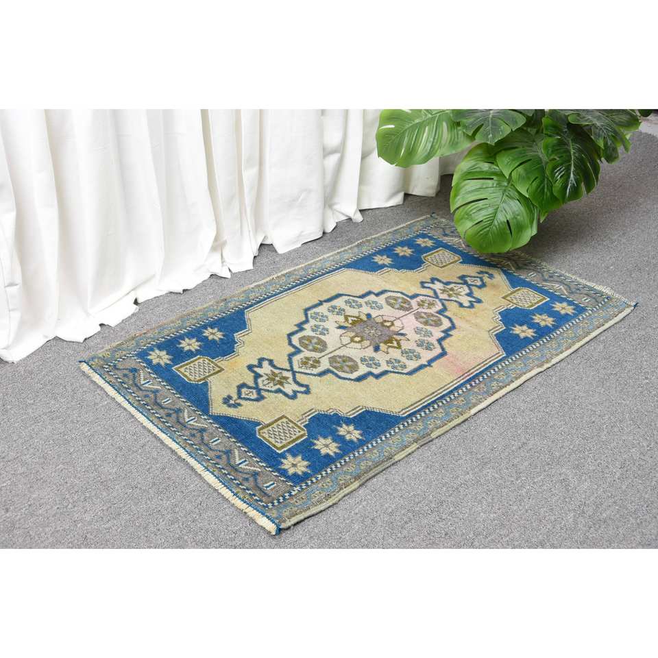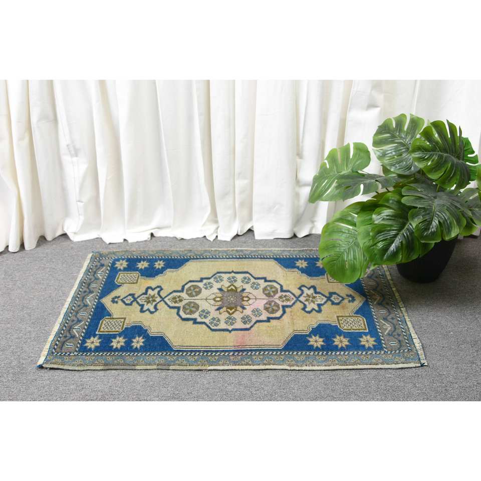 พรมขนสัตว์สีเบจสีน้ำเงินคลาสสิก2.8ft 1.7 x งานเย็บปะสไตล์ตุรกีสำหรับห้องนั่งเล่นหรือห้องนอนพร้อมแผ่นรองทำจากยาง